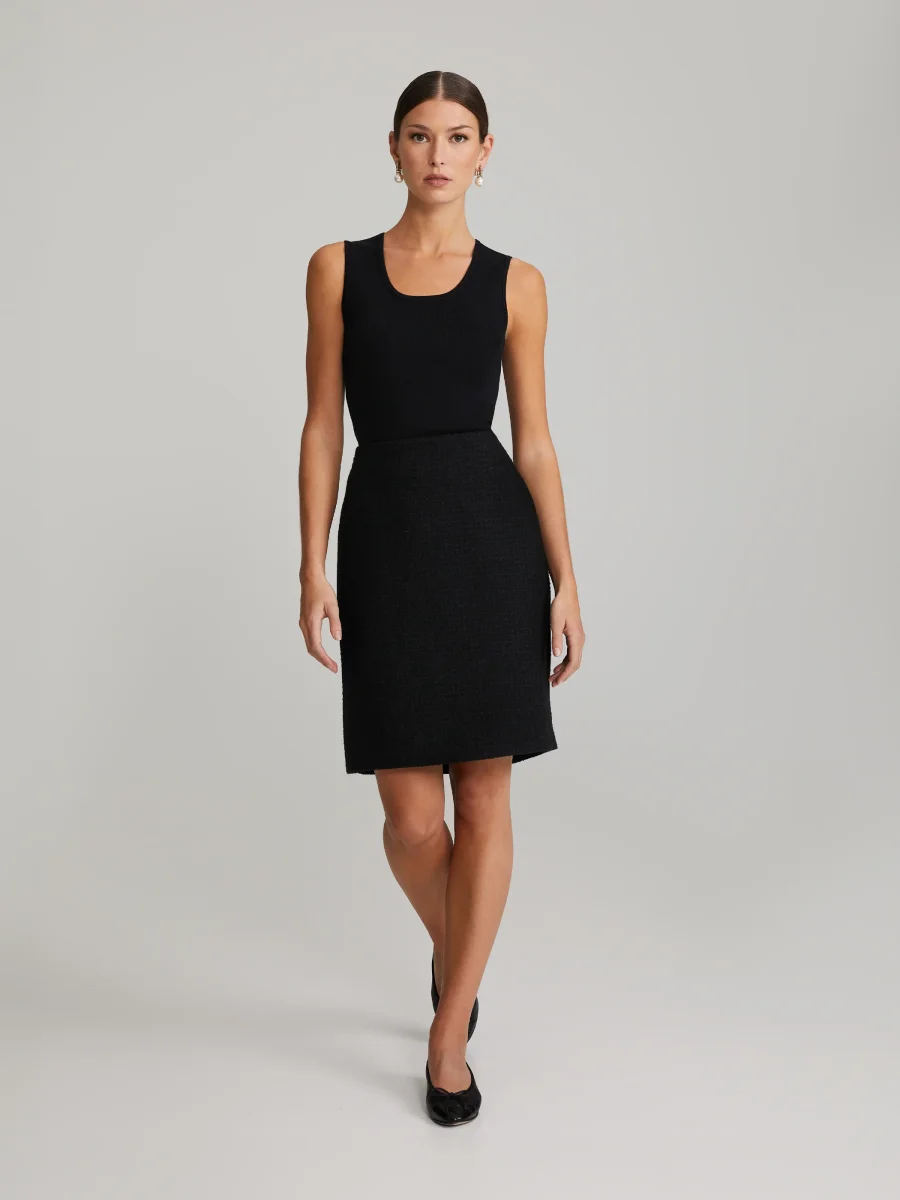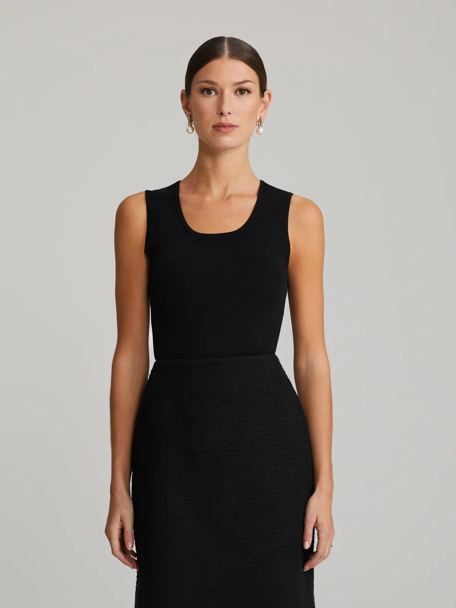 Ärmlös stickad topp i mjuk viskos, som har anti-pilling egenskaper. Toppen är figursydd och har breda axelband. Kombinera med Jella Omlott Blus.