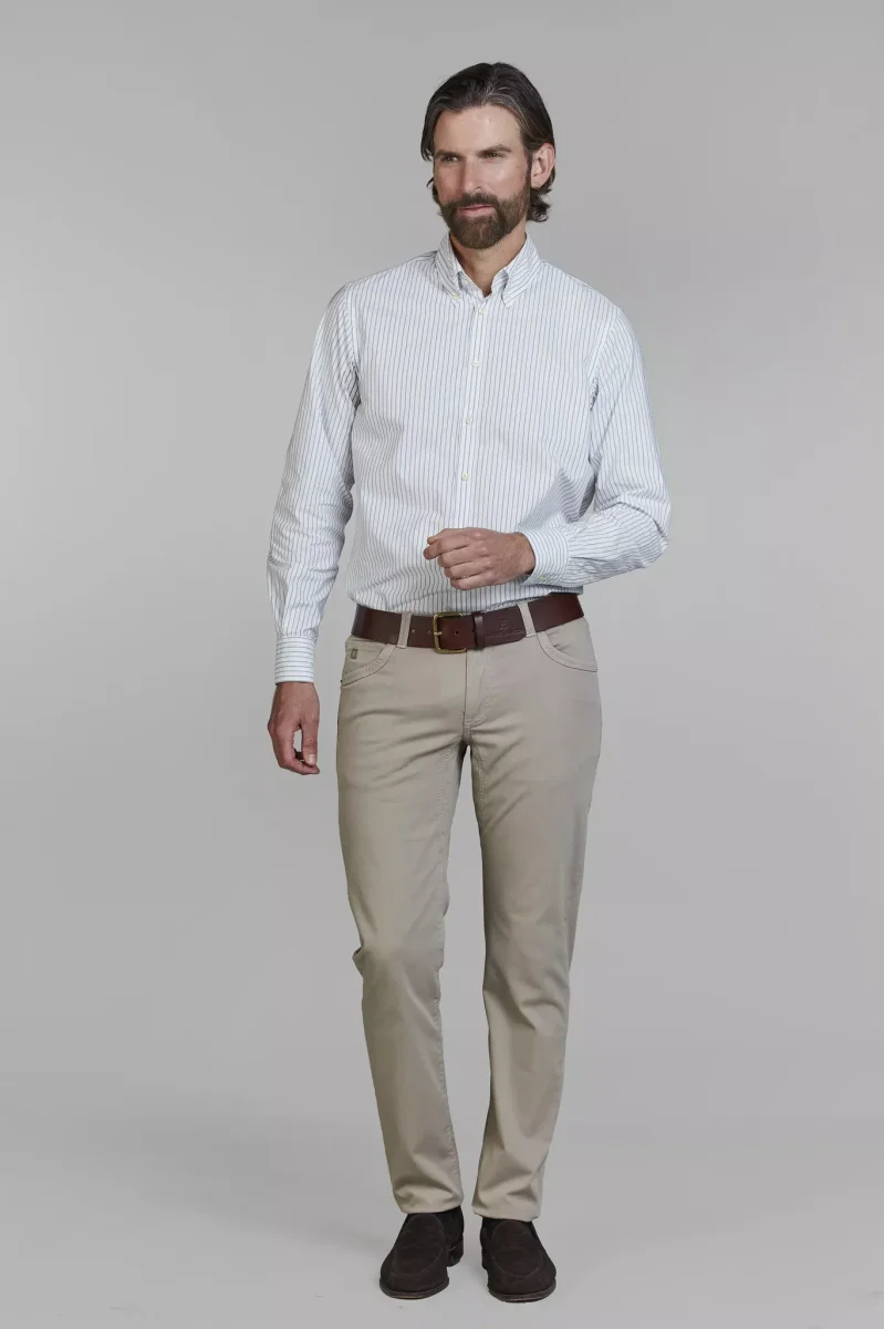 Denna femficksbyxa i vävd stretchstruktur kombinerar komfort och exklusivitet. Med förstärkt gren, bartucks och självlåsande YKK-dragkedja är det en byxa för den som söker både hållbarhet och sofistikerad design, producerad i fabriker med högsta kvalitetsstandard.