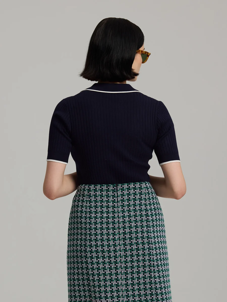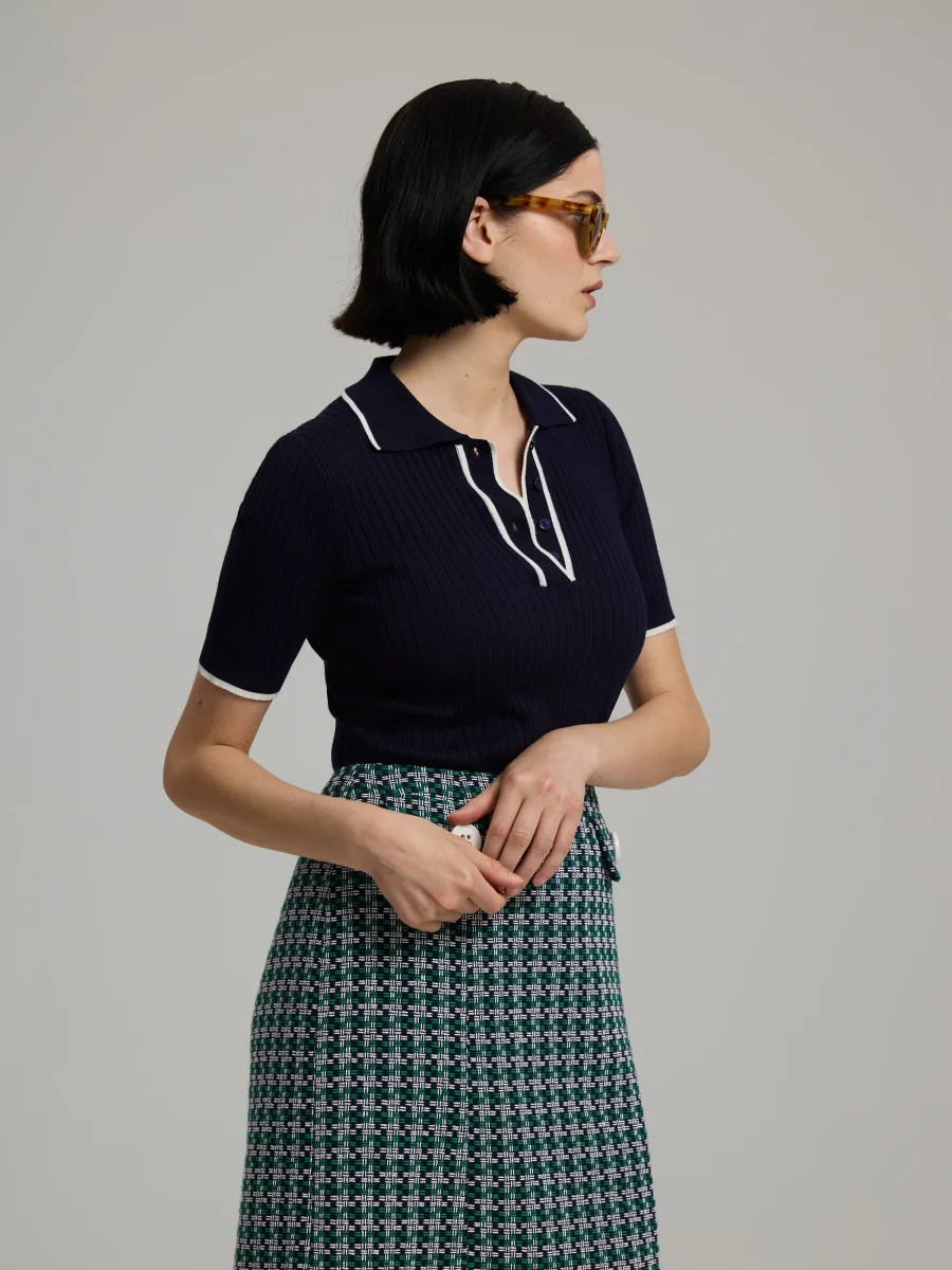 Rib-knitted short sleeve slim-fit knit with collar, featuring contrast stripes at sleeve openings, collar and button placket. Finished with navy blue buttons.