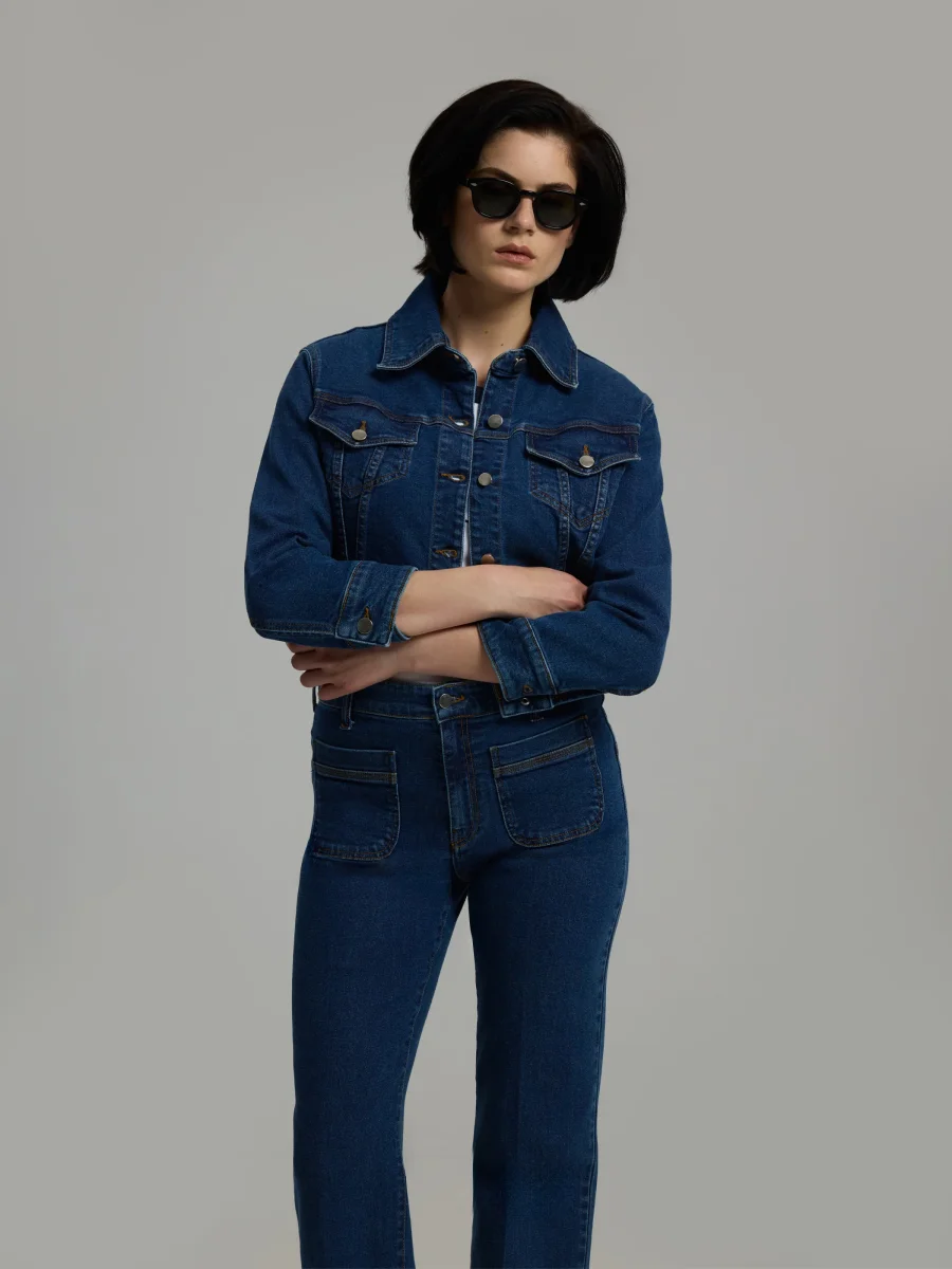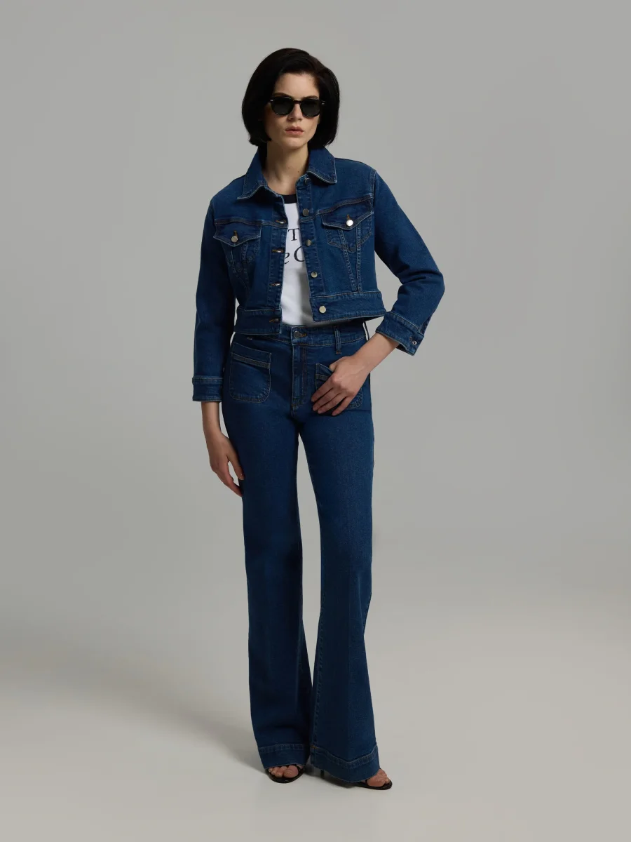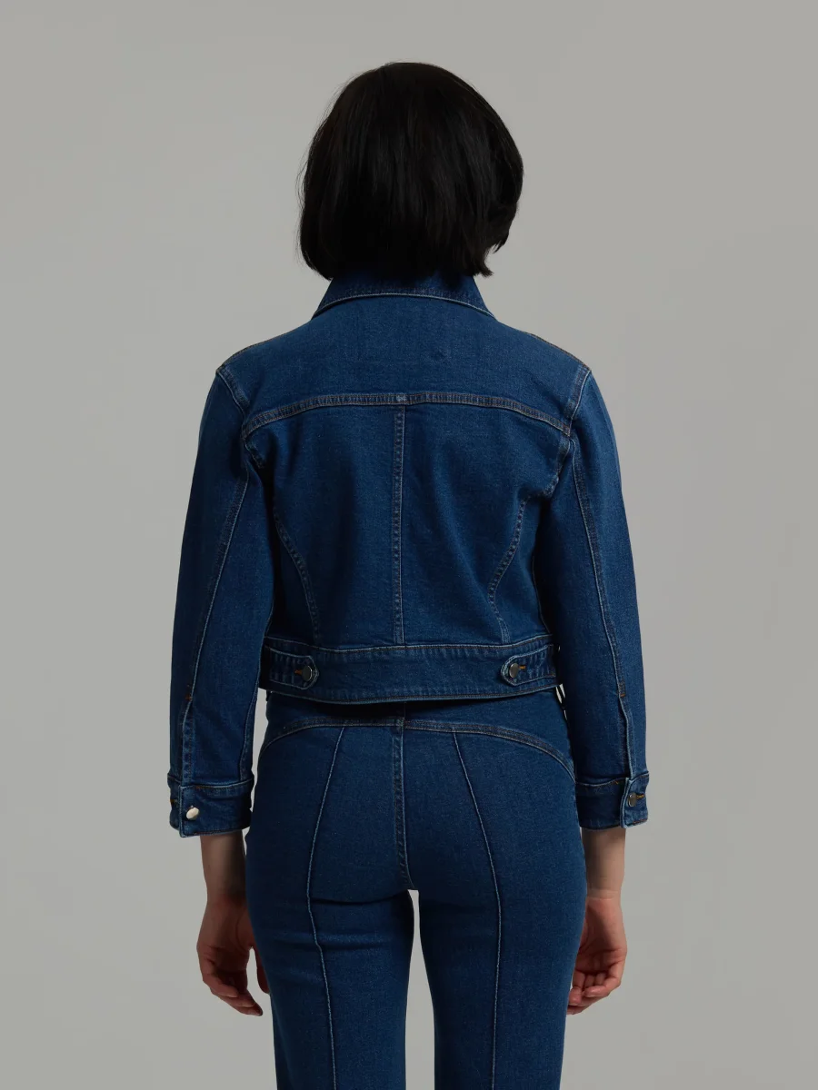 Denim jacket with 3/4-length sleeves and a slightly cropped fit. Features a classic collar, button-front closure, and chest pockets with buttoned flaps. Finished with buttoned cuffs and waistband tabs. Made from comfortable stretch denim.