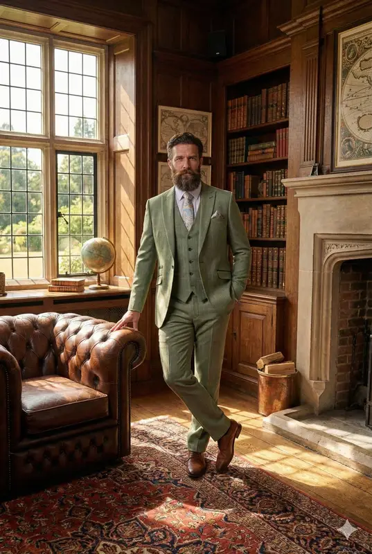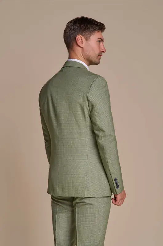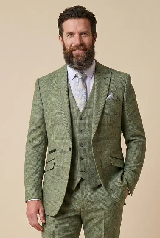 Det tre-delade setet består av byxor, en väst och en kavaj. En perfekt kostym för sommaren. Både insidan och utsidan är fulländade med vackra detaljer. På slaget finns en reversnål med kedja. Den är också lätt att ta bort. Tyget har en vacker färg med en lätt rutig design. Dessutom har fickorna lätta gröna detaljer och det har också använts vackra matchande knappar. Insidan är också vackert färdig med en färgglad innerfoder.