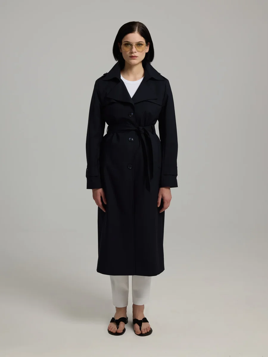 Slim-fit classic trench coat designed with a clean, structured silhouette. The tailored fit and refined finishing touches make it an elegant choice for both everyday wear and more polished looks.