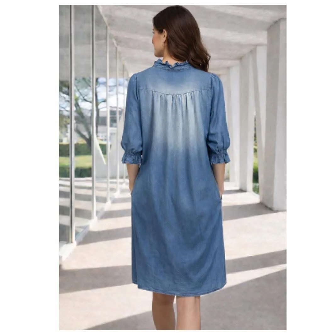 Klänning i mjuk tencell från Chica London med dekorativa delajer och knappslå, sidfickor och trekvartsärm med resår. Mått • Armhåla till armhåla omkrets: ca 120 cm • Längd, axel och ner: ca 101 cm fram och 108 cm bak. Produktinformation: Färg: Jeansfärgad Storlek: One size Material: 100% tencell Varumärke: Chica London