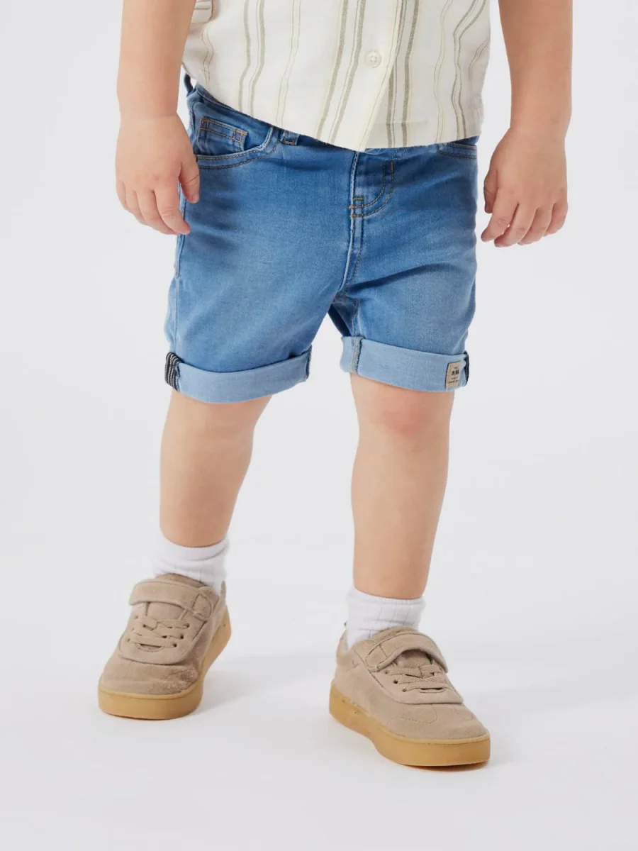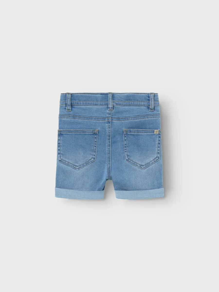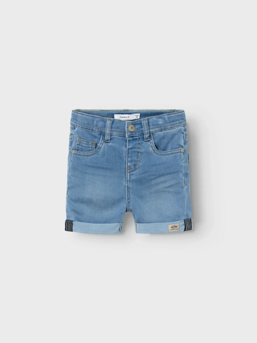 Superstretchiga jeansshorts med reglerbar resår i midjan.