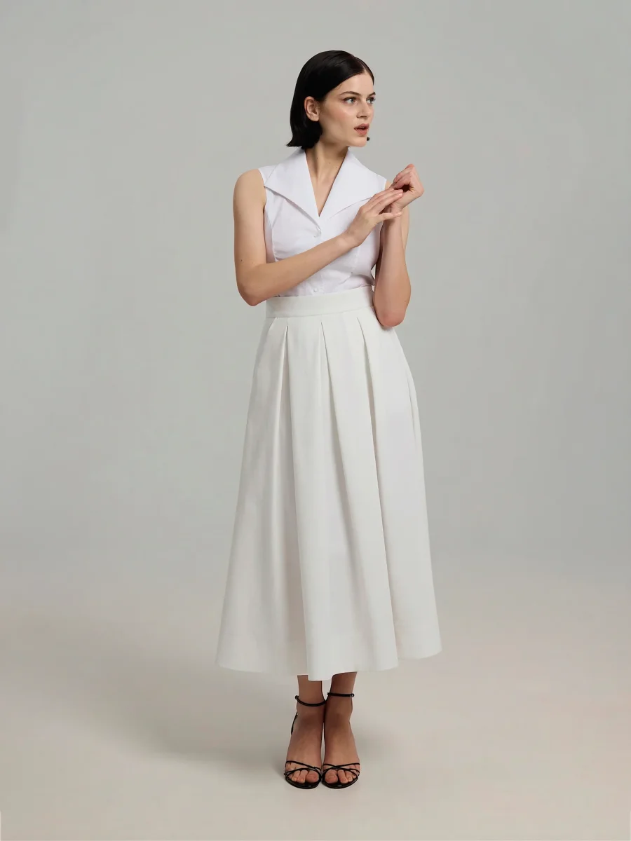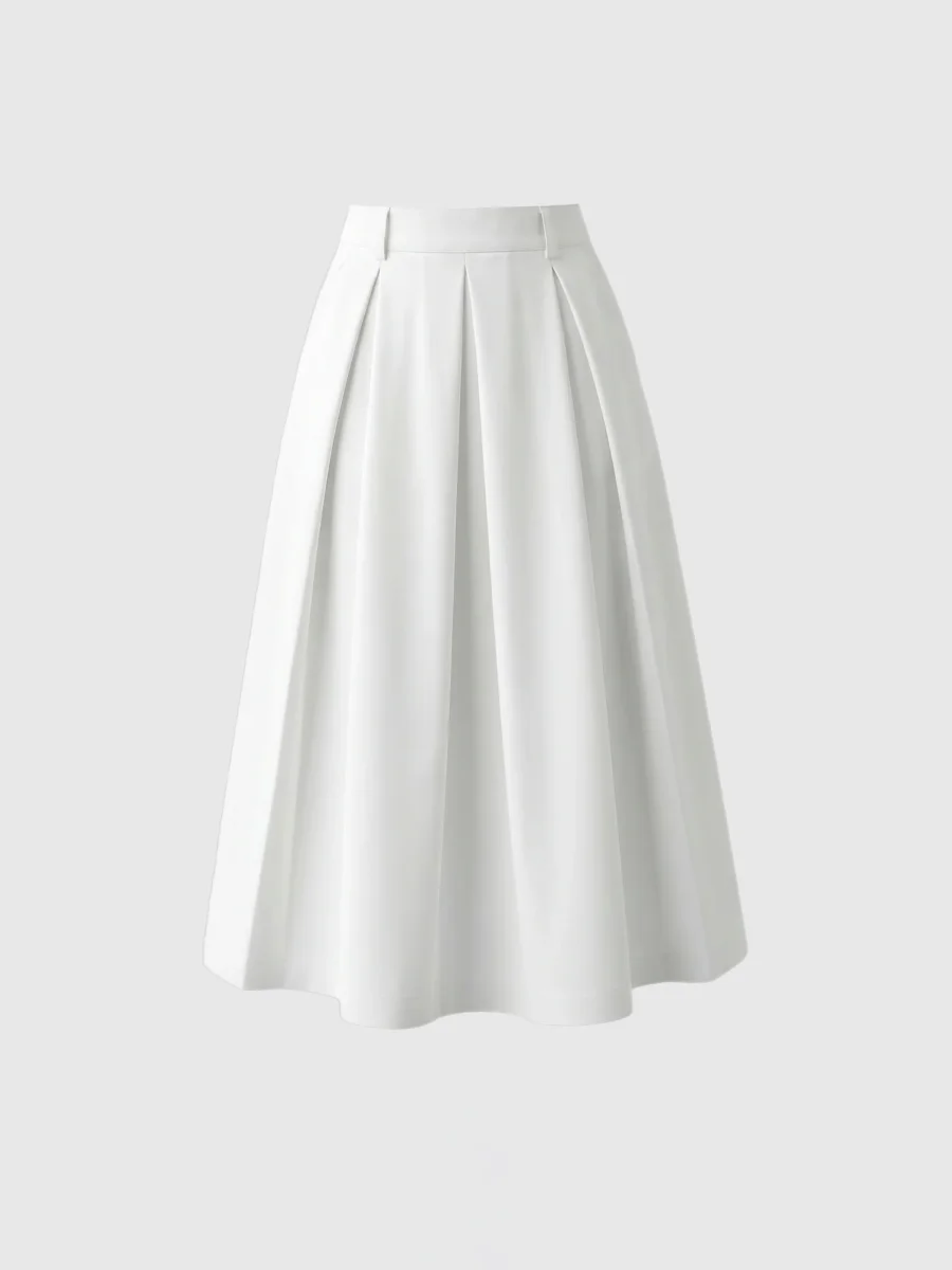 A voluminous pleated skirt with an A-line silhouette. The midi-length hem creates a timeless shape that works effortlessly for both everyday wear and more polished occasions. Crafted from high-quality Italian cotton blend. A-line silhouette Midi length Large pleats Side pockets Belt loops