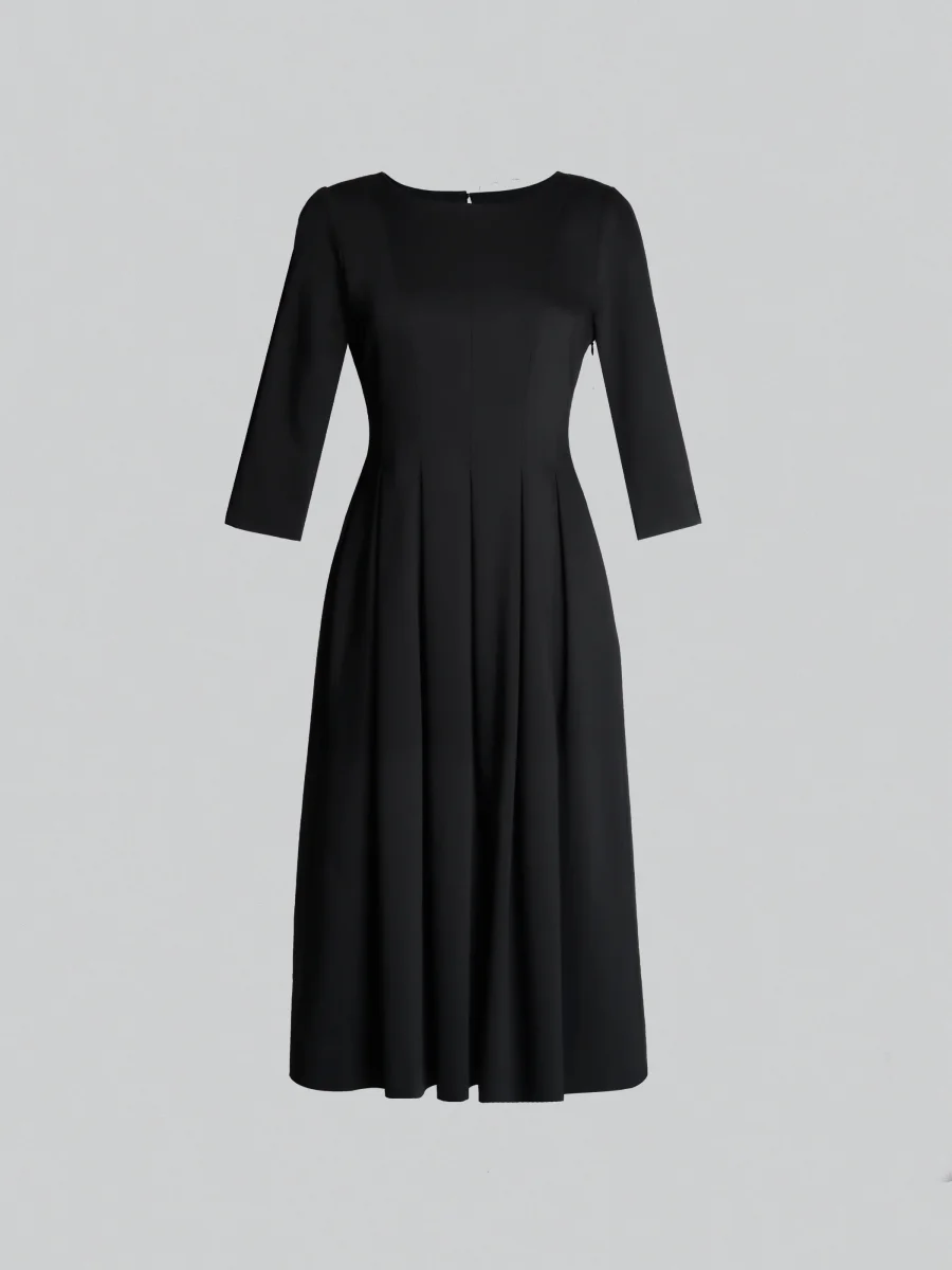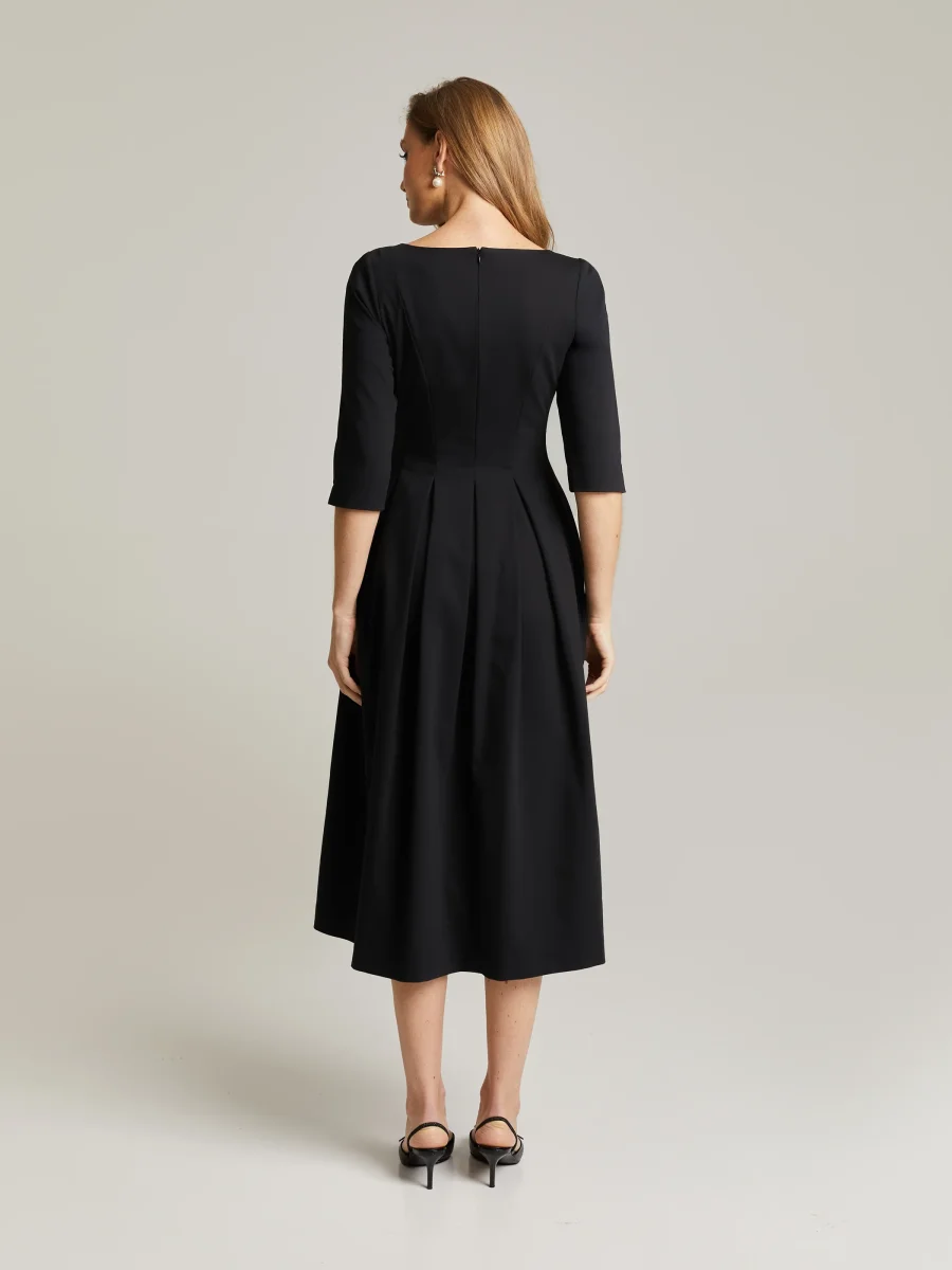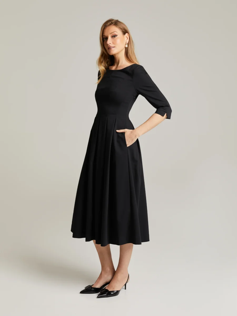 Mellanlång klänning gjord av en bomullsblandning. Figursytt liv, 3/4 -ärmar och A-linje fåll med veck. Rund halsringning samt öppning och knapp bak i nacken. Dolda fickor och dragkedja i sidan.