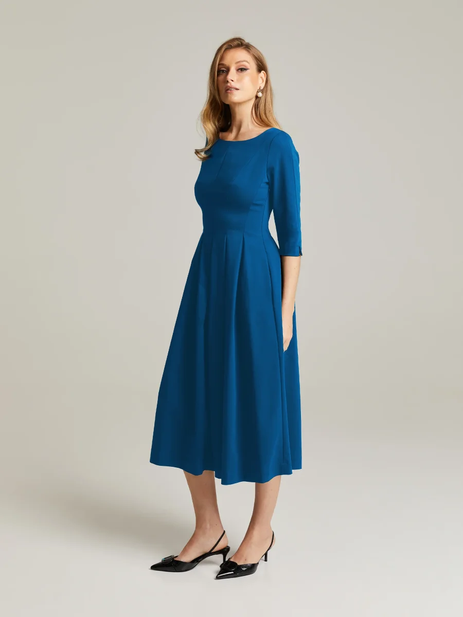 Mellanlång klänning gjord av en bomullsblandning. Figursytt liv, 3/4 -ärmar och A-linje fåll med veck. Rund halsringning samt öppning och knapp bak i nacken. Dolda fickor och dragkedja i sidan.