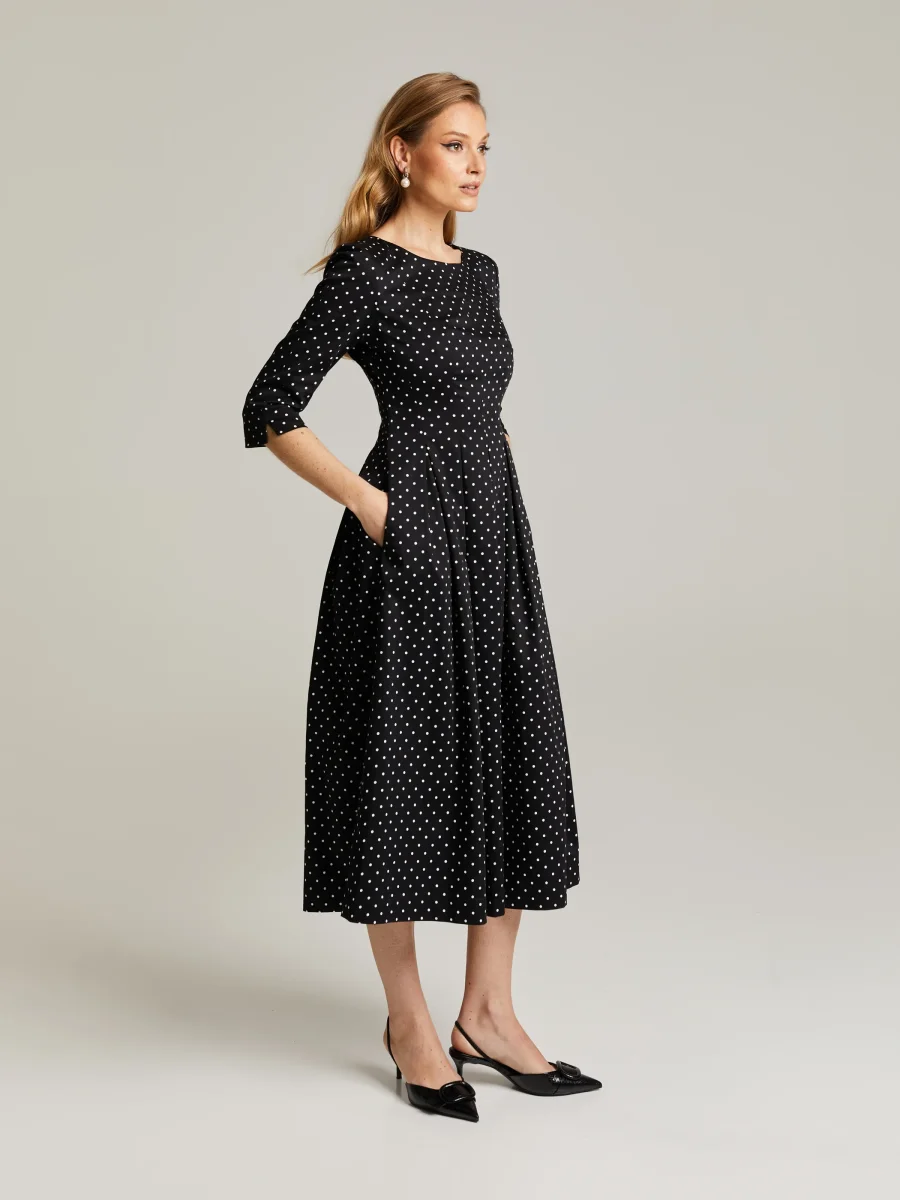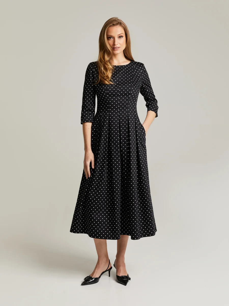 Mellanlång klänning med polka-dot-mönster, gjord av en bomullsblandning. Figursytt liv, 3/4-ärmar och A-linjeformad fåll med veck. Rund halsringning, dolda fickor och dragkedja i sidan.