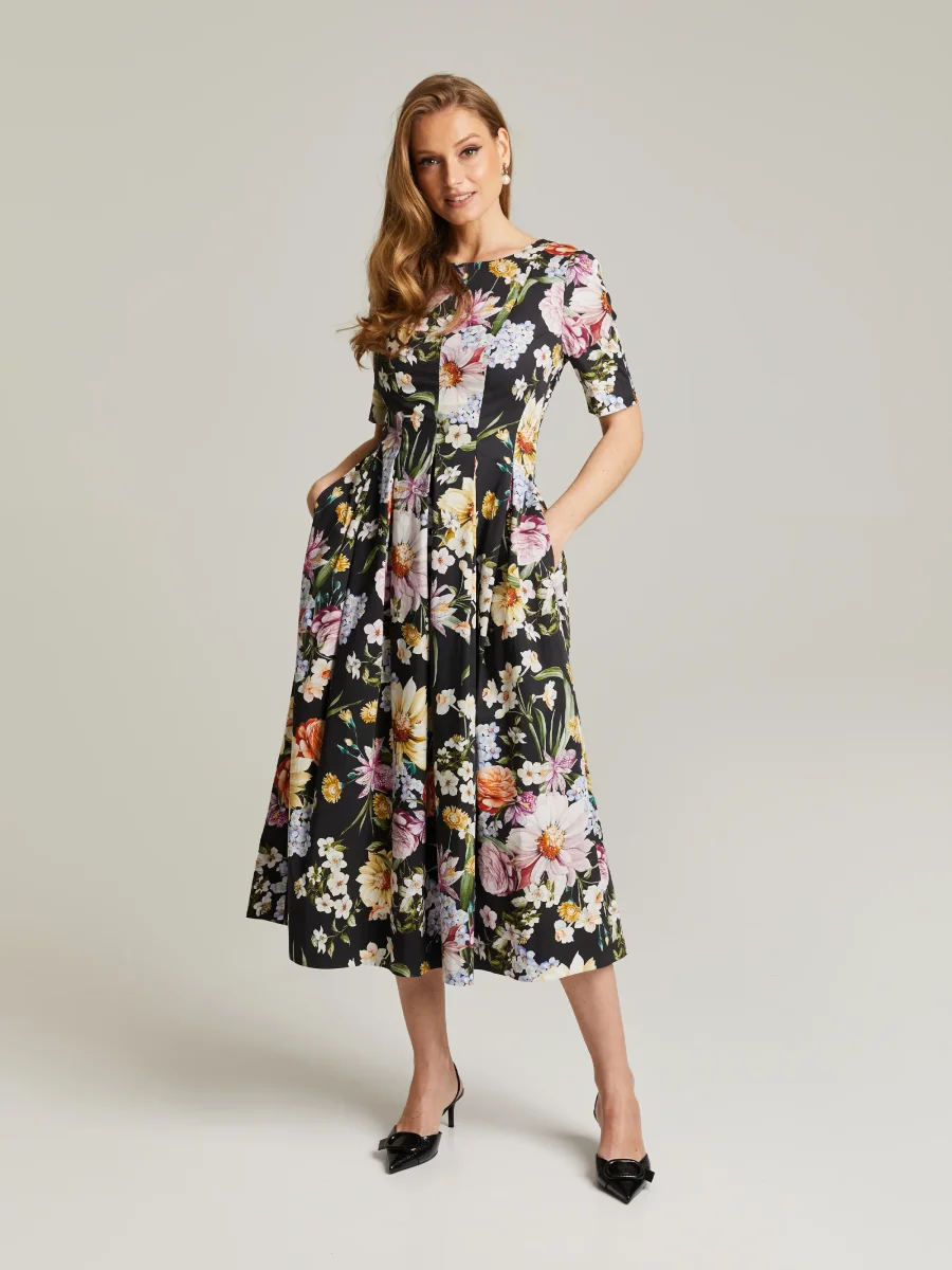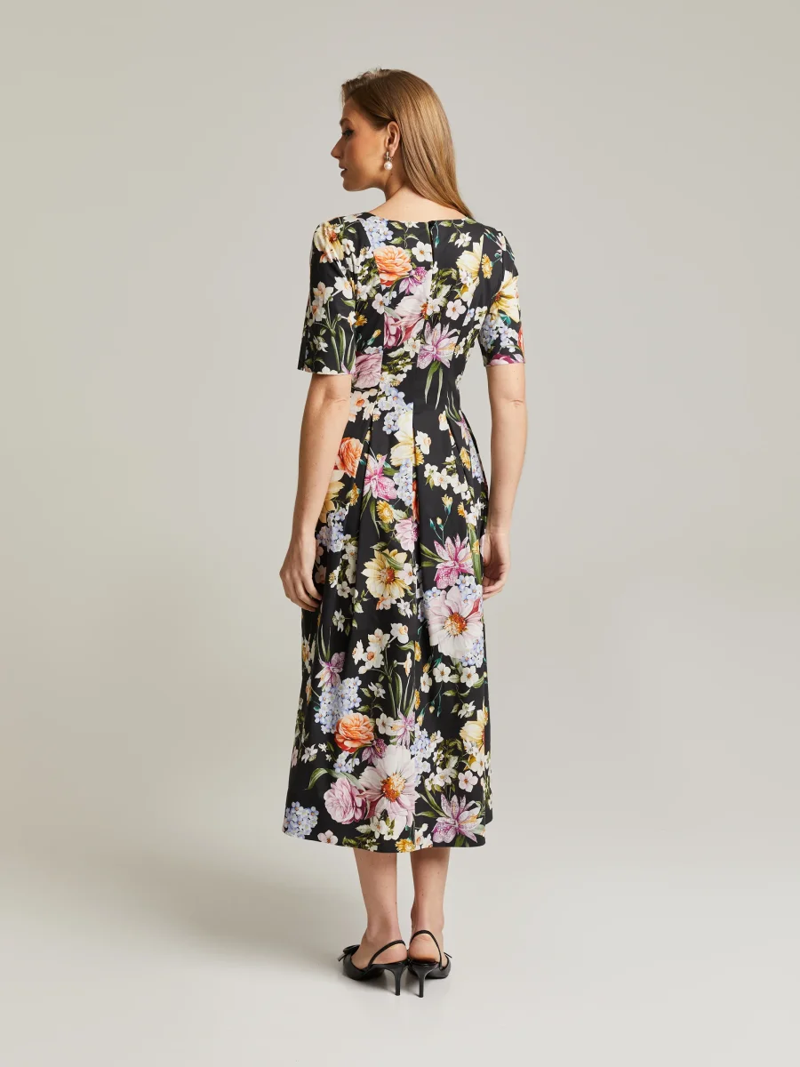 Mellanlång klänning gjord av en bomullsblandning. A-linje fåll med veck och rund halsringning. Dold dragkedja i sidan och i ryggen.