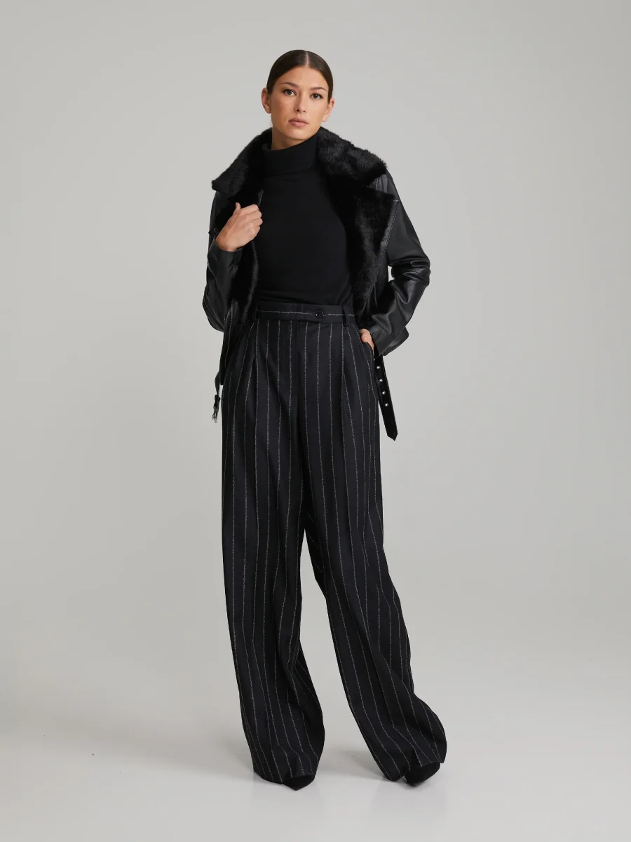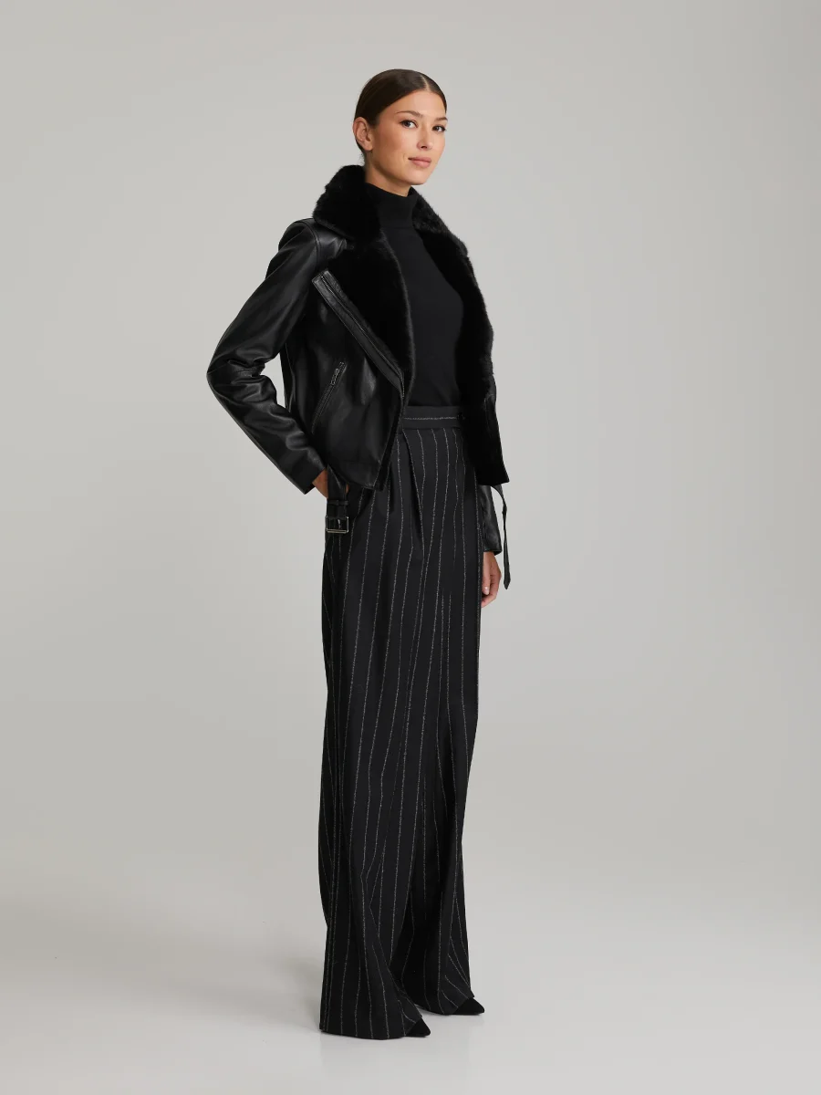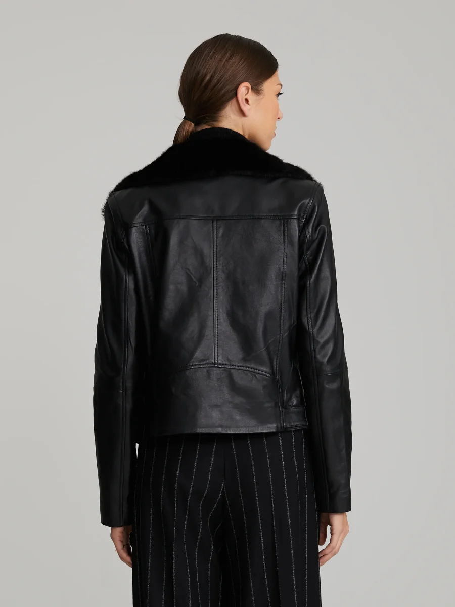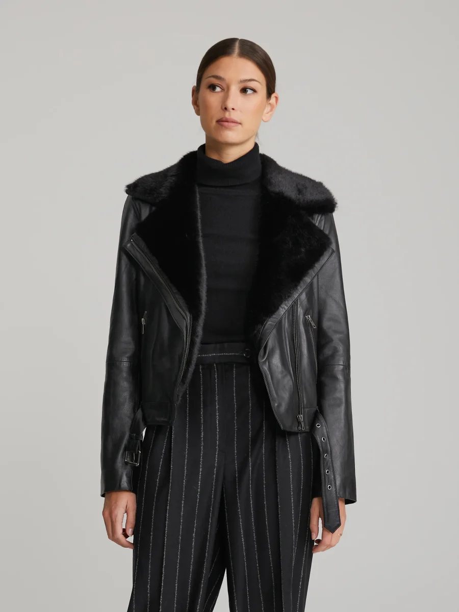 Klassisk läderjacka med fuskpälskrage, sidfickor och skärp. Jackan har ett foder med bekväm stretch.