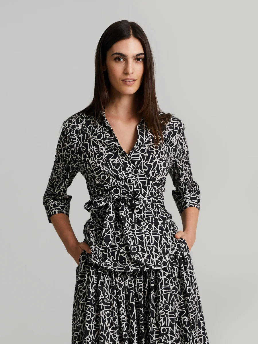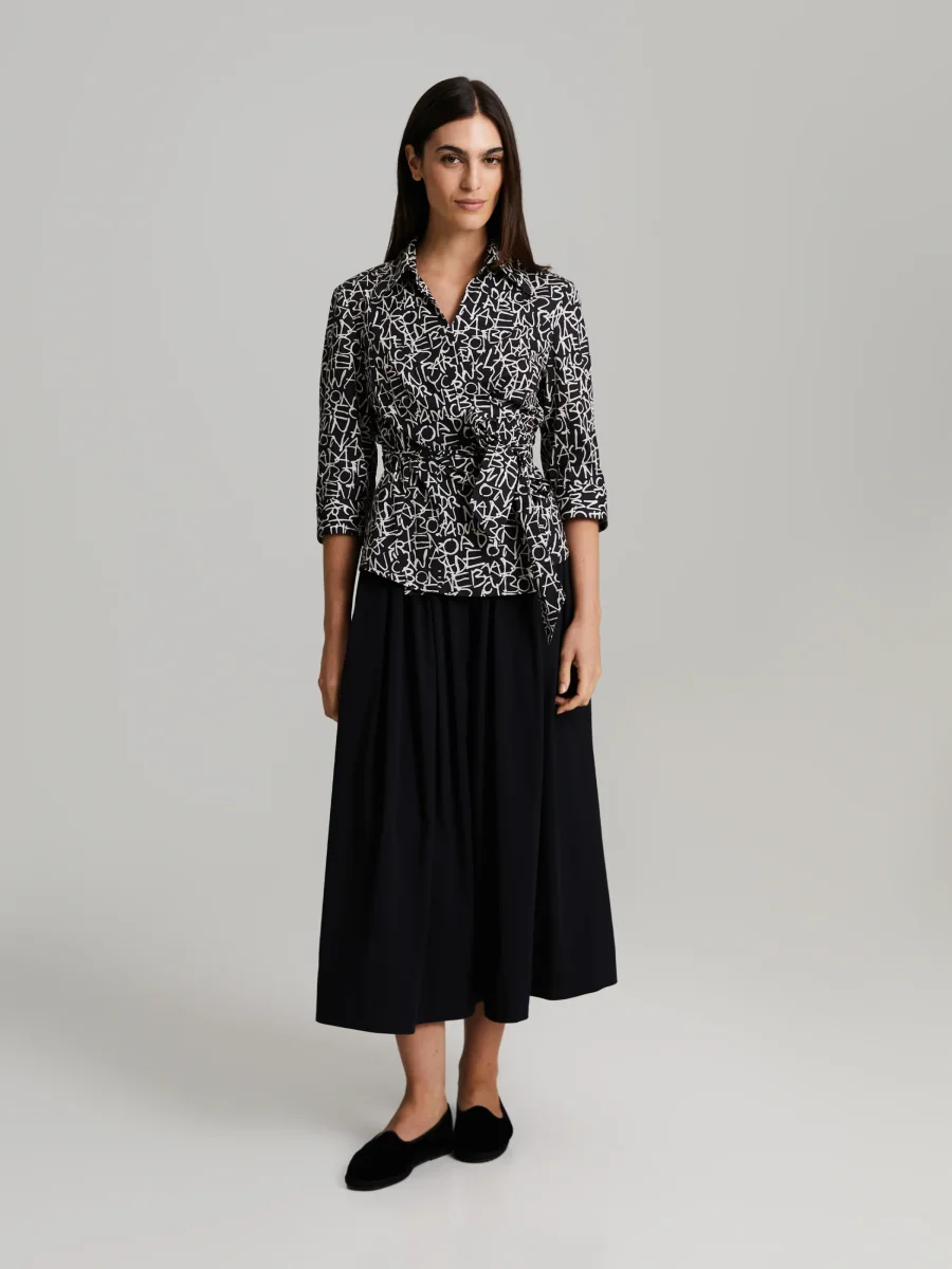 Omlottblus i mjuk bomull. Skjortan har åtsittande passform, trekvarts ärmar, krage och ett knytband i midjan.