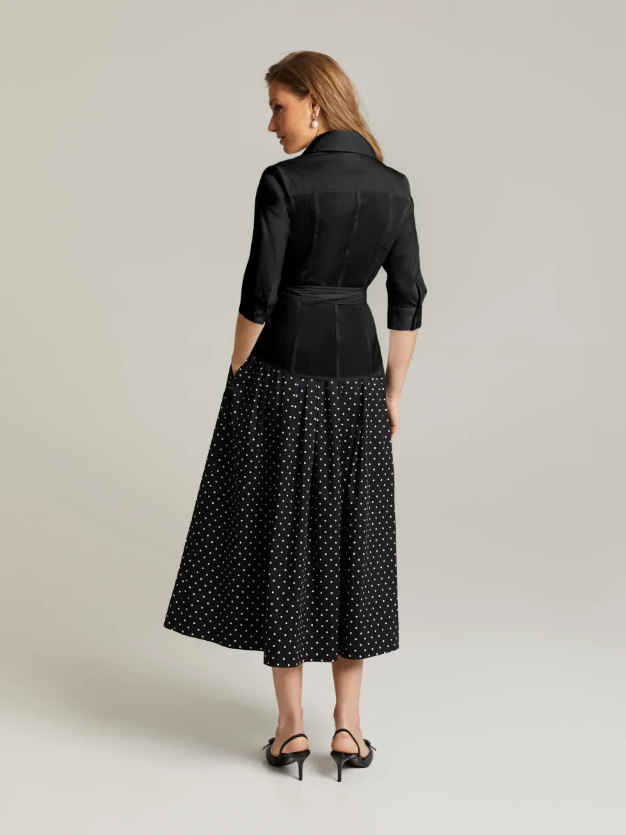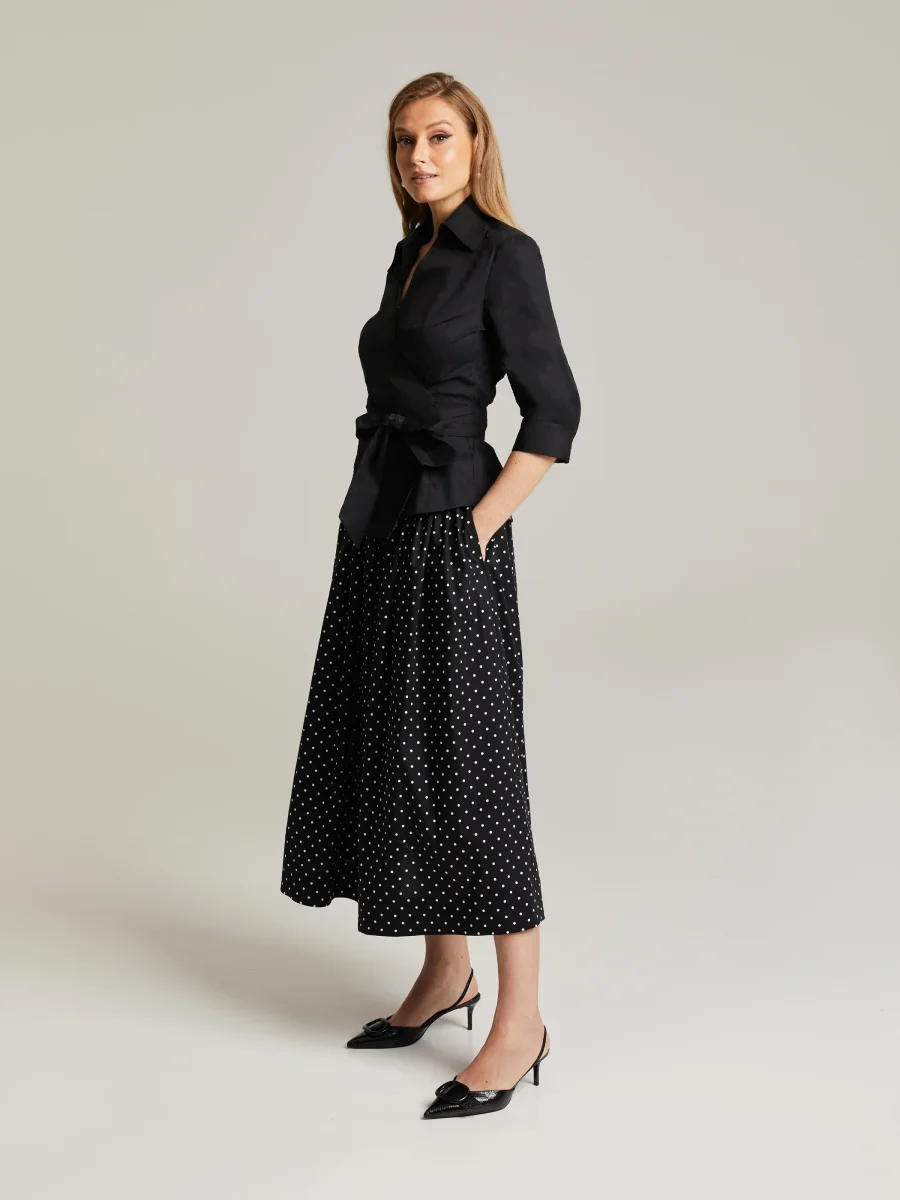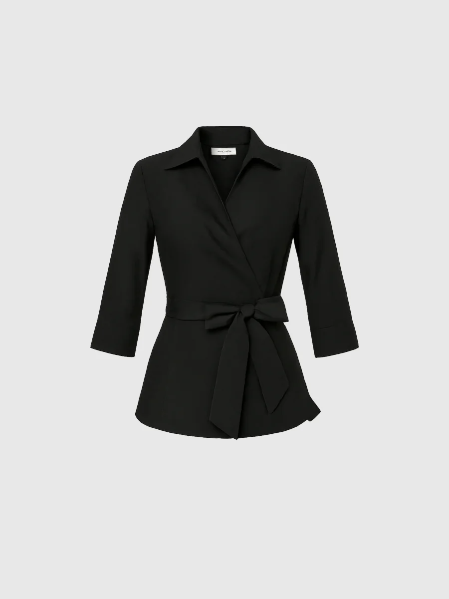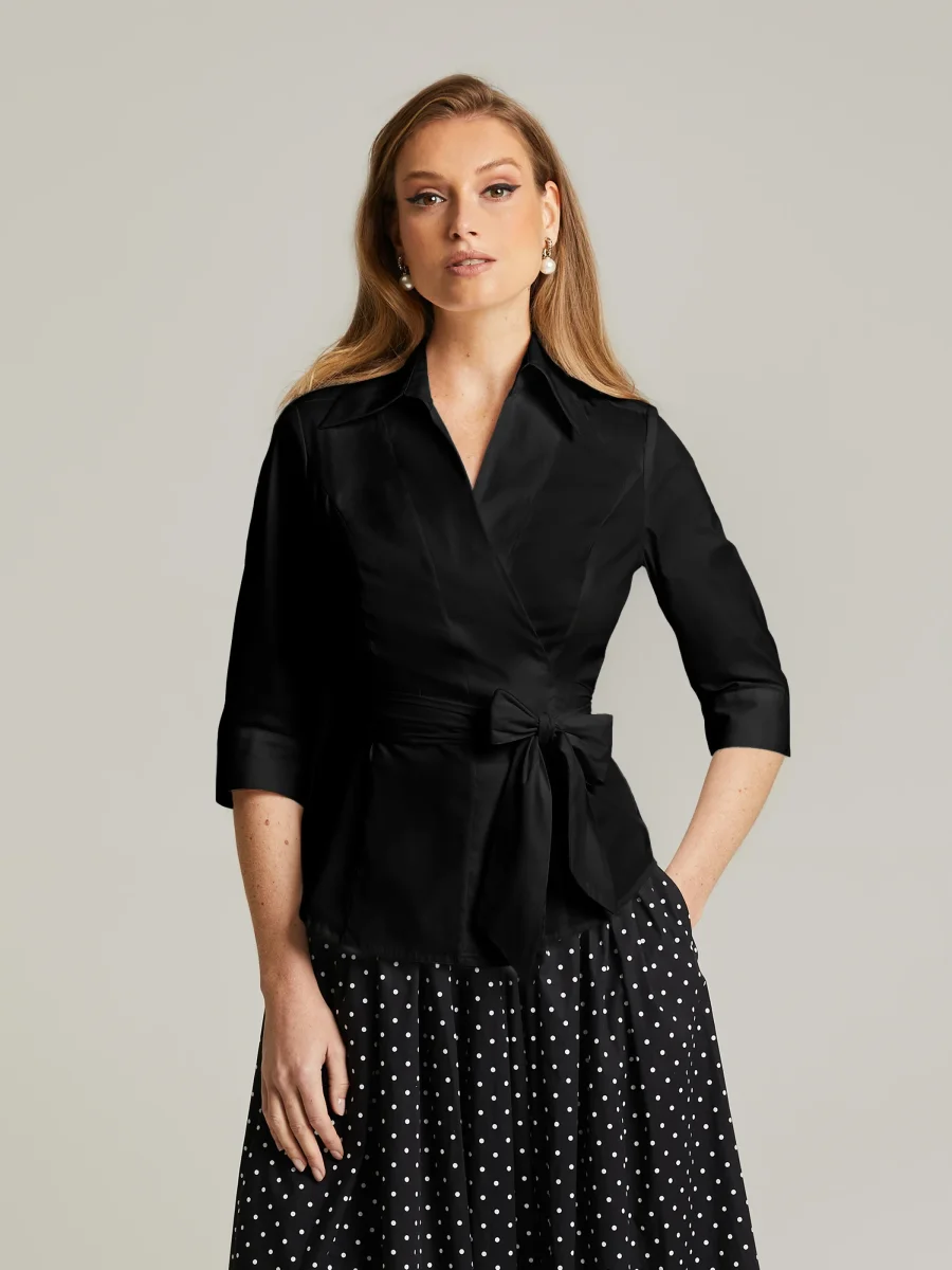 Omlottblus i mjuk bomull. Skjortan har åtsittande passform, trekvarts ärmar, krage och ett knytband i midjan.