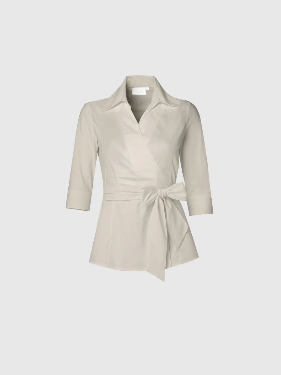 Omlottblus i mjuk bomull. Skjortan har åtsittande passform, trekvarts ärmar, krage och ett knytband i midjan.
