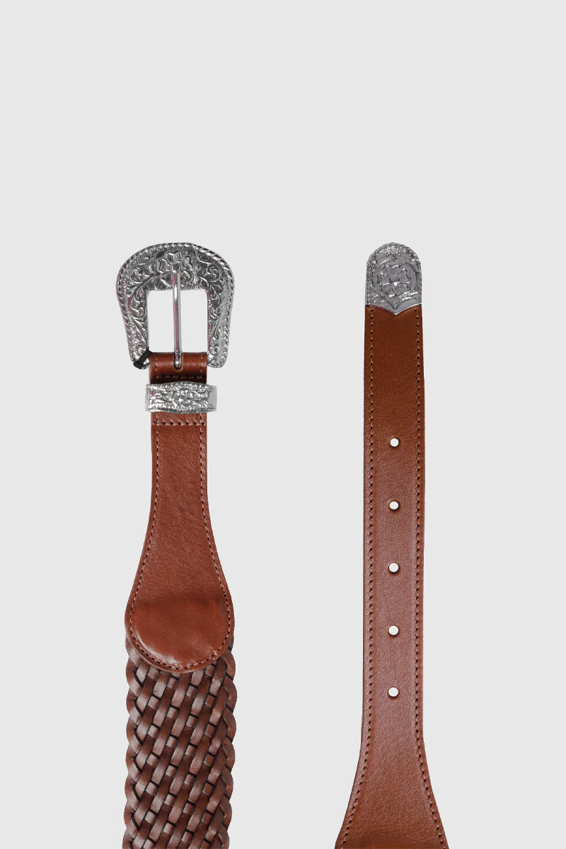 Flätat läderbälte i ekbrunt med silvermetalldetaljer och spänne.