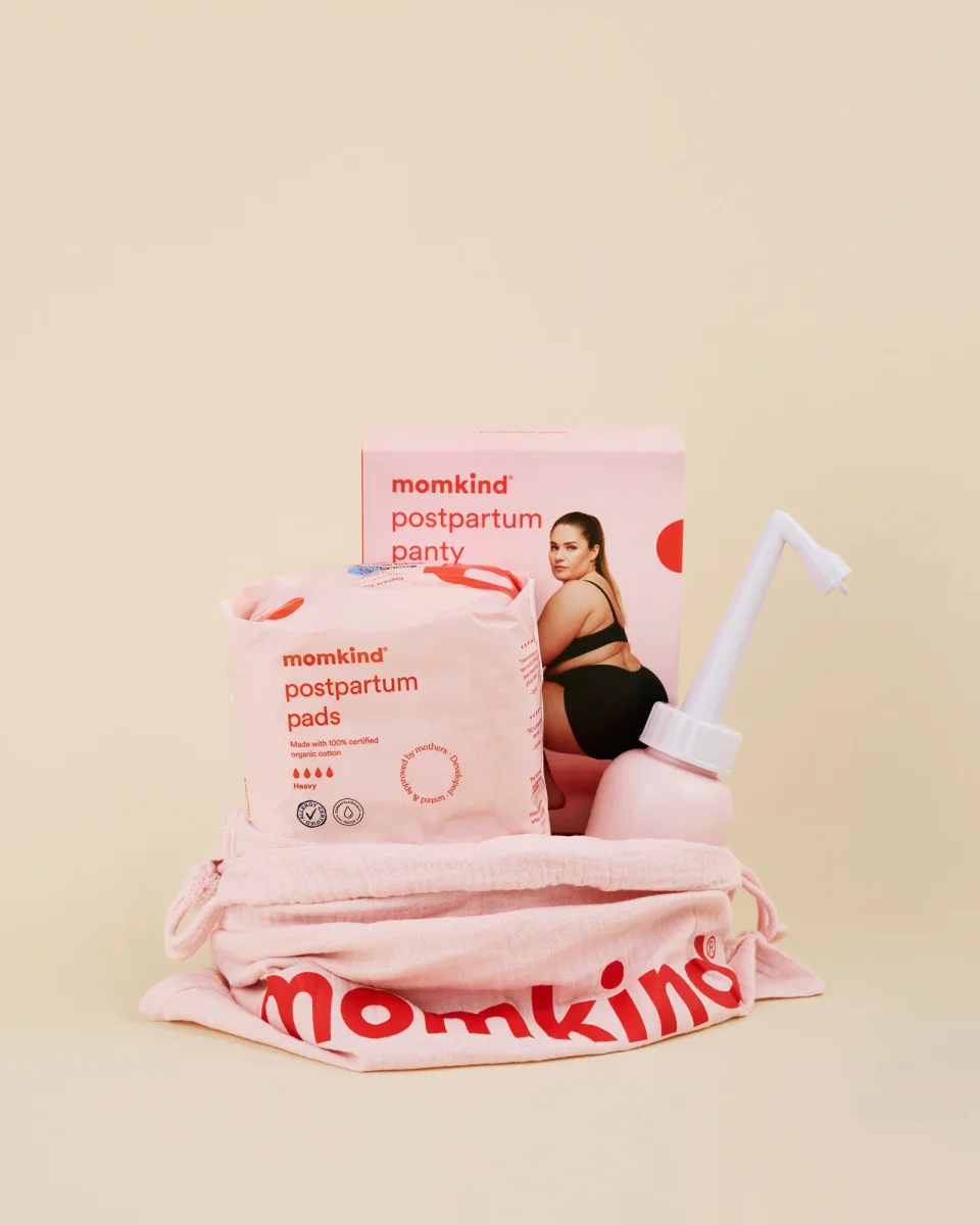Vårt minsta efter förlossning kit med intimdusch, förlossningsbindor och postpartum trosor, samt en söt vårdpåse och en gratis guidebok.