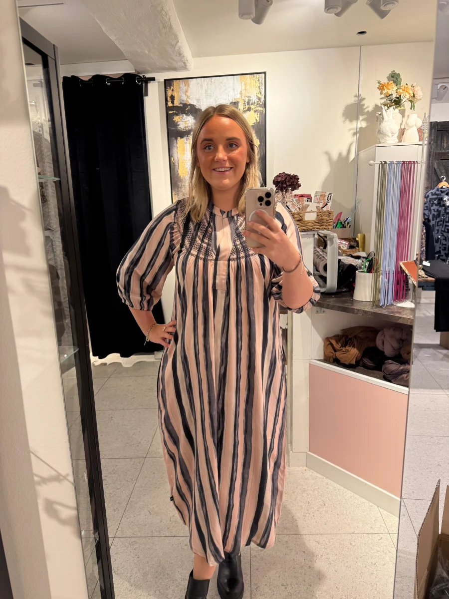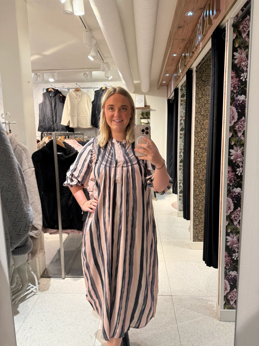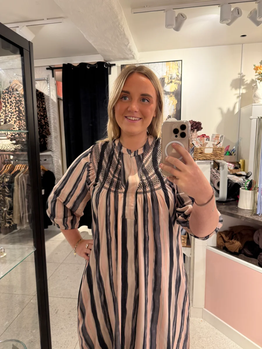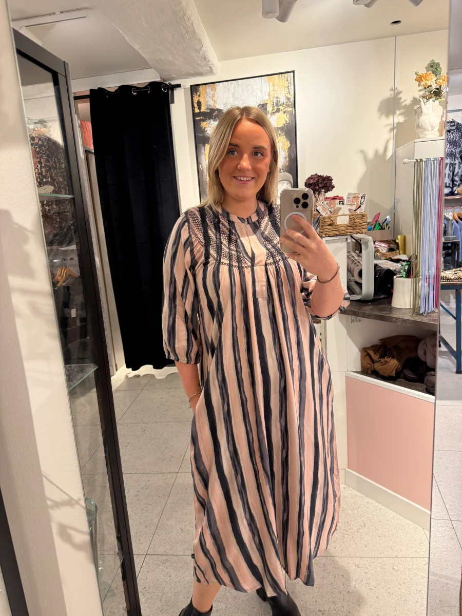 En snygg klänning med 3/4 dels långa ärmar, denna kan du både bära till vardags och festligare tillfällen, det är smock runt hals ringningen vilket ger en fin touch.