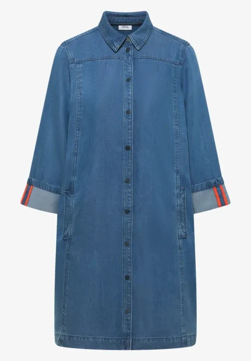 Denimklänning från CECIL medmoderiktigt utseende och med lyocells mjuka känsla – för en avslappnad vardagslook. Skjortkrage, långa ärmar, sidfickor och en heltäckande knappslå gör klänningen mångsidig. Den avslappnade passformen är bekväm och perfekt för en avslappnad look.
