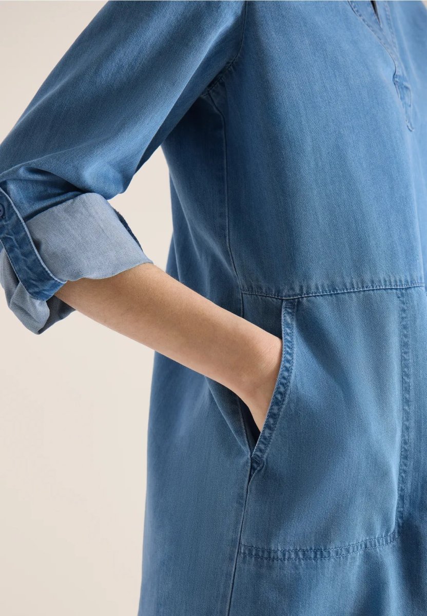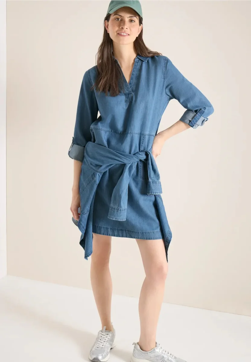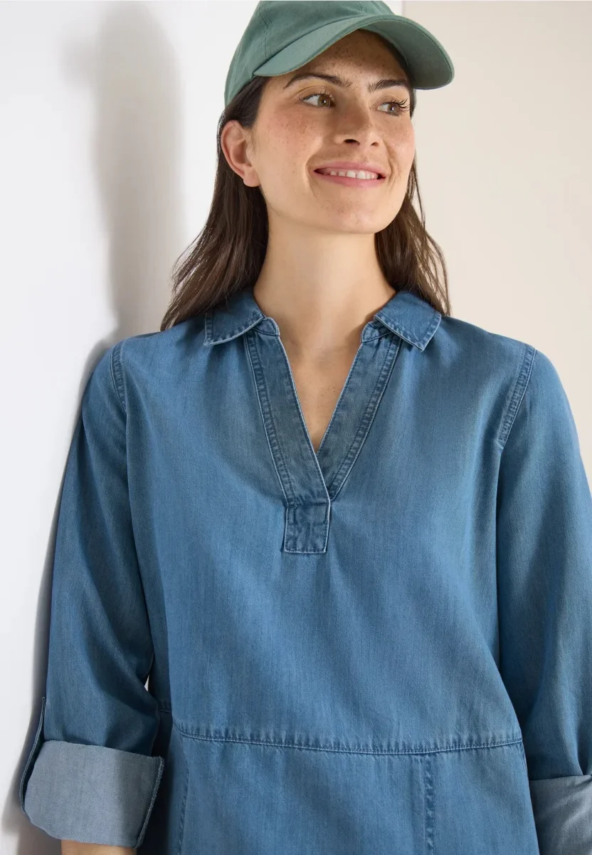 Denimklänning i bomullsblandning från CECIL med moderiktigt utseende och för en avslappnad vardagslook. Skjortkrage, långa ärmar, sidfickor och gör klänningen mångsidig. Den avslappnade passformen är bekväm och perfekt för en avslappnad look.