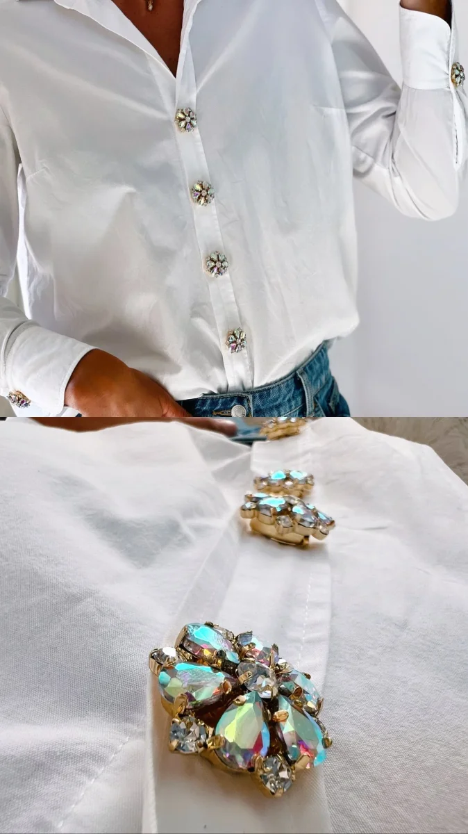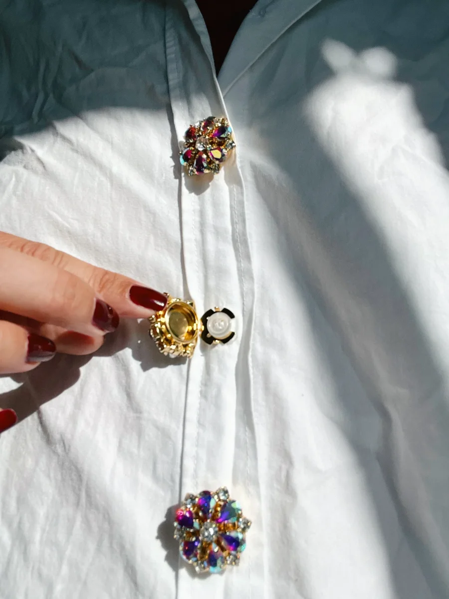6 st blomformade knappsmycken med guldfärgat underrede, glittrande stenar som bildar en blomma. Klicka fast den på en vanlig knapp på max 13 mm.