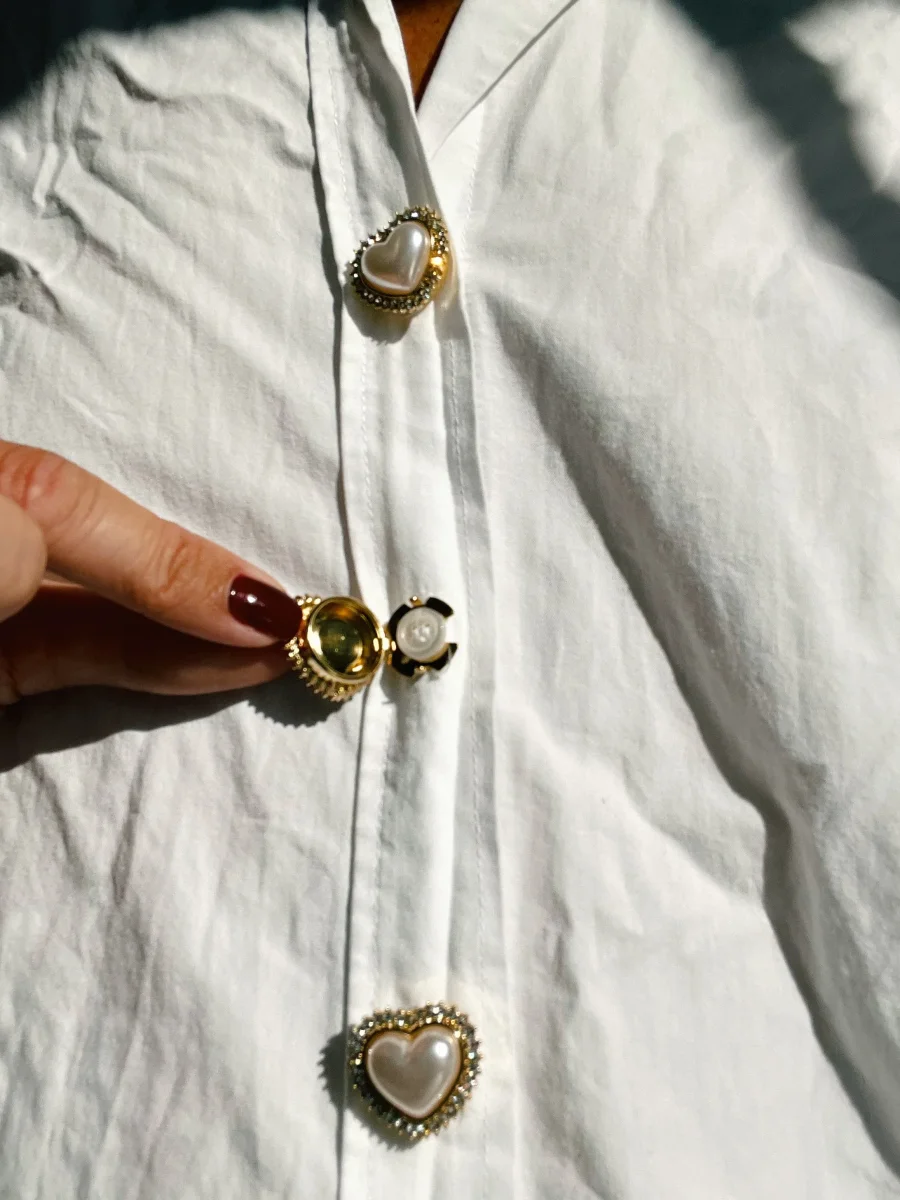 6 st blomformade knappsmycken med guldfärgat underrede, glittrande stenar som bildar en blomma. Klicka fast den på en vanlig knapp på max 13 mm.