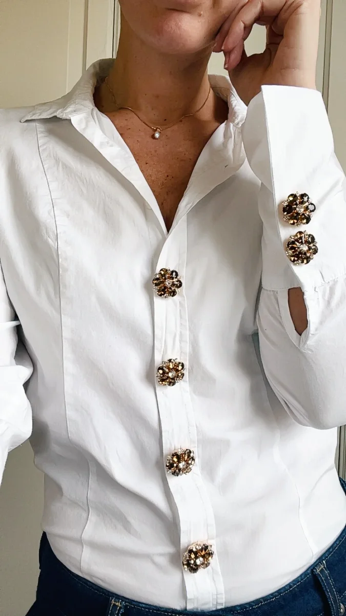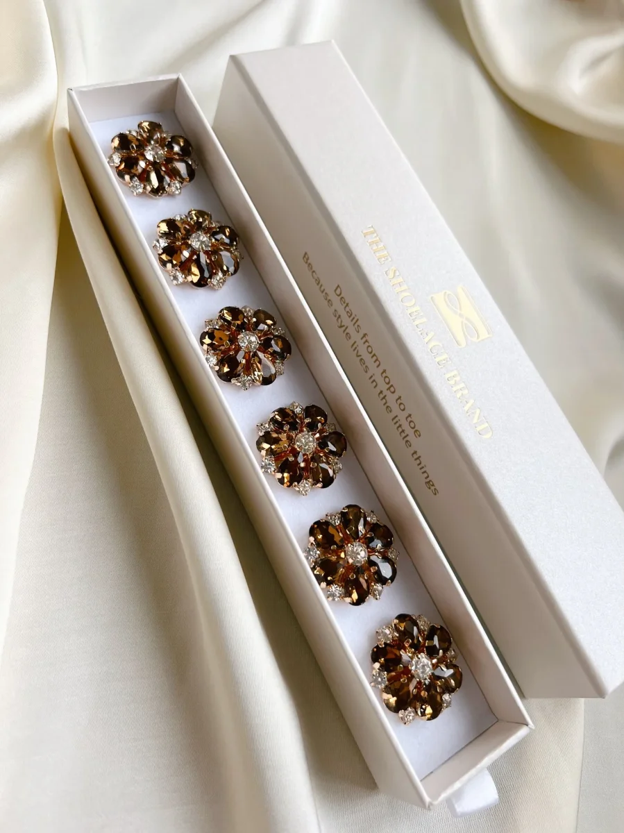6 st blomformade knappsmycken med guldfärgat underrede, glittrande stenar som bildar en blomma. Klicka fast den på en vanlig knapp på max 13 mm.
