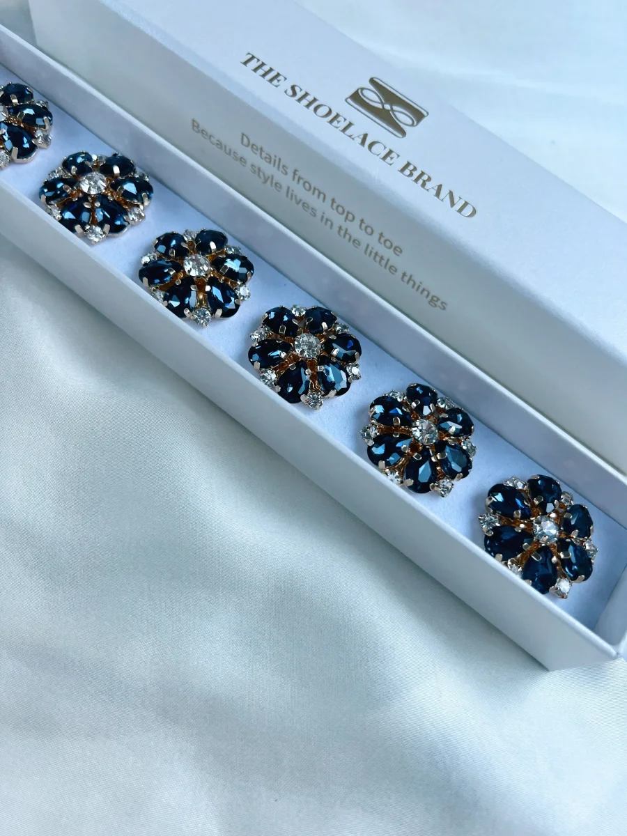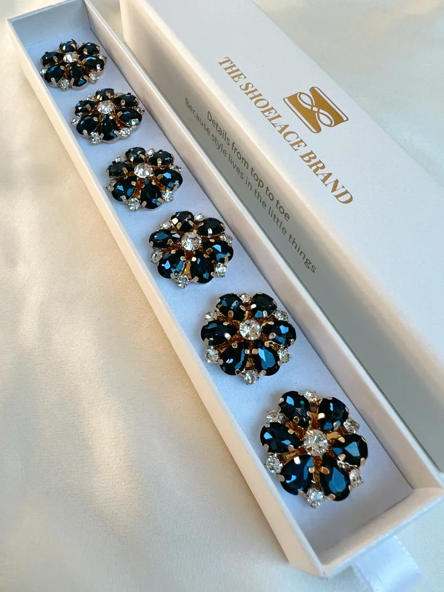 6 st blomformade knappsmycken med guldfärgat underrede, glittrande stenar som bildar en blomma. Klicka fast den på en vanlig knapp på max 13 mm.