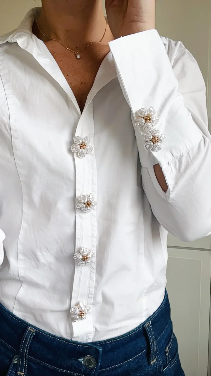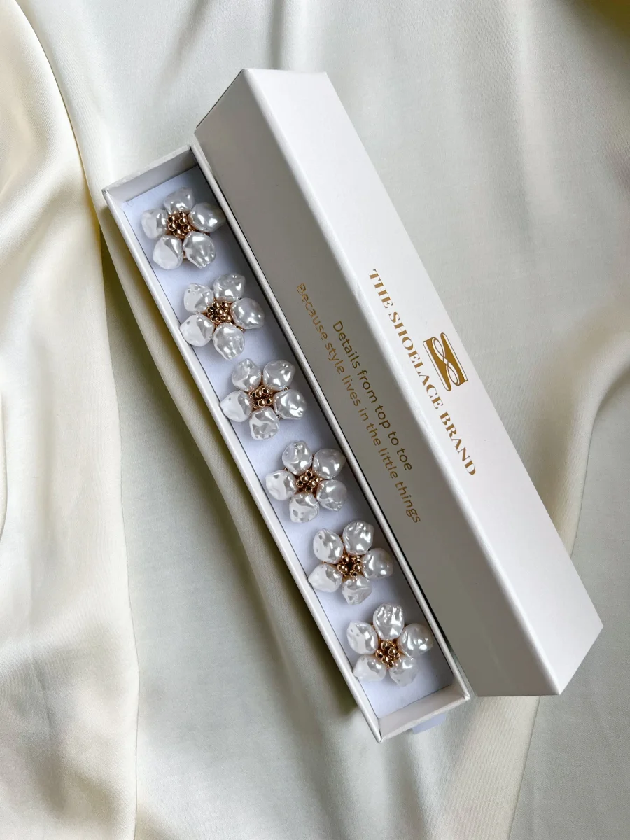 6 st blomformade knappsmycken med guldfärgat underrede.