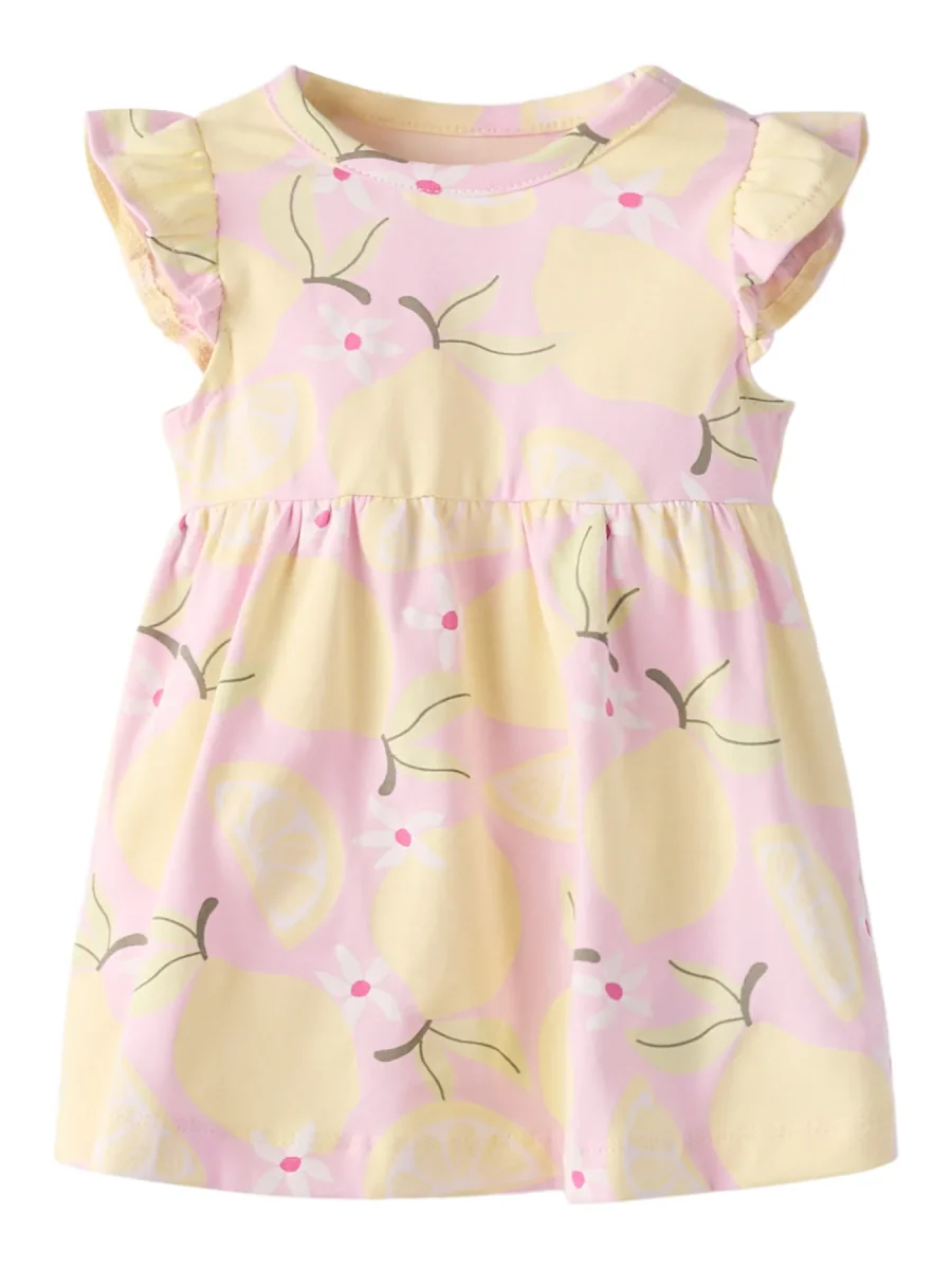 En söt och somrig klänning för baby i mjuk rosa färg med lekfulla gula citroner. Det charmiga mönstret ger klänningen en glad och somrig känsla som passar perfekt under varmare dagar.