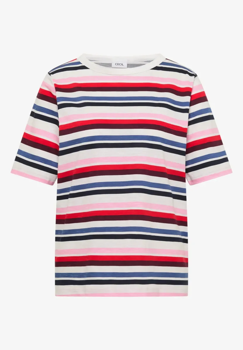 En randig t-shirt som sticker ut från mängden. Det flammiga garnet ger tyget en levande, nästan handgjord textur – långt ifrån den platta känslan hos en vanlig bomullst-shirt. Det moderna flerfärgade randmönstret i vitt, rött, rosa, marinblått och blått är festligt utan att vara skrikigt, och passar lika bra på en sommardag i stan som vid havet.