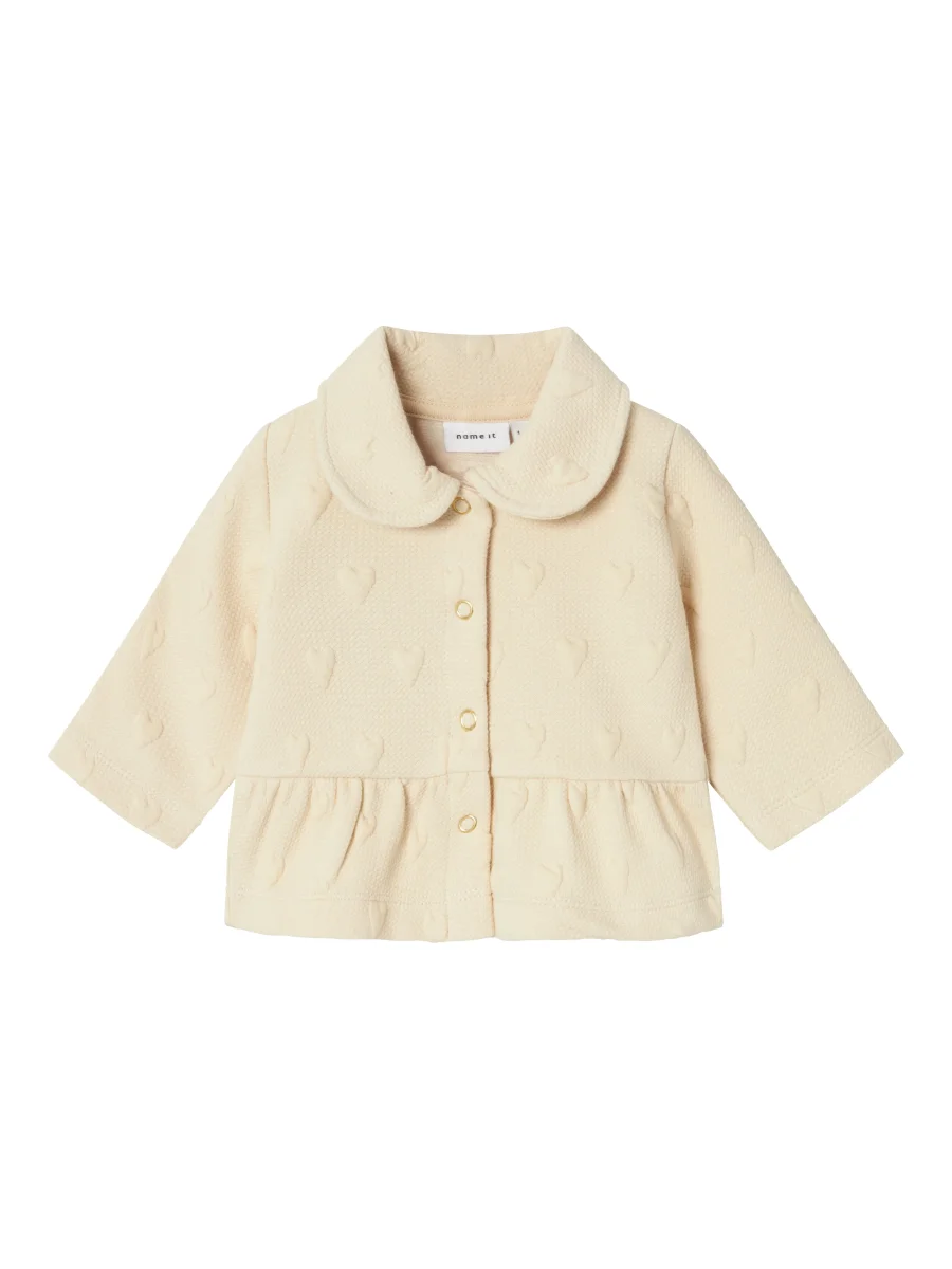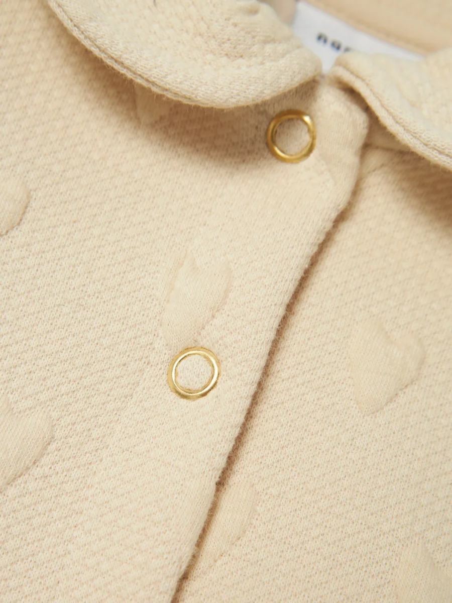 Söt baby kofta i naturvit / beige kviltad modell. Supersöt liten jacka perfekt när du vill klä din bebis både trendigt, klassiskt och samtidigt avslappnat. Vi älskar detta plagg med hjärtan.