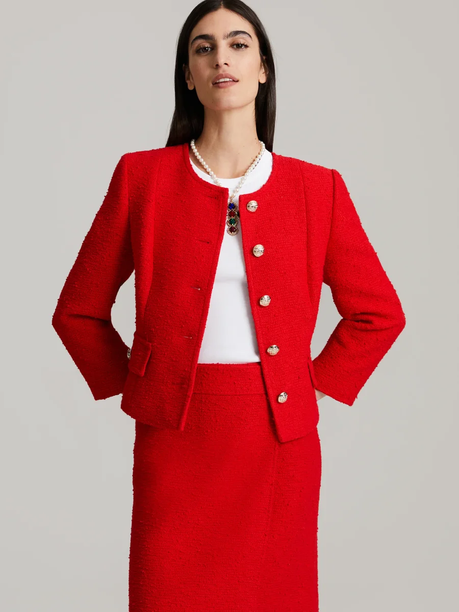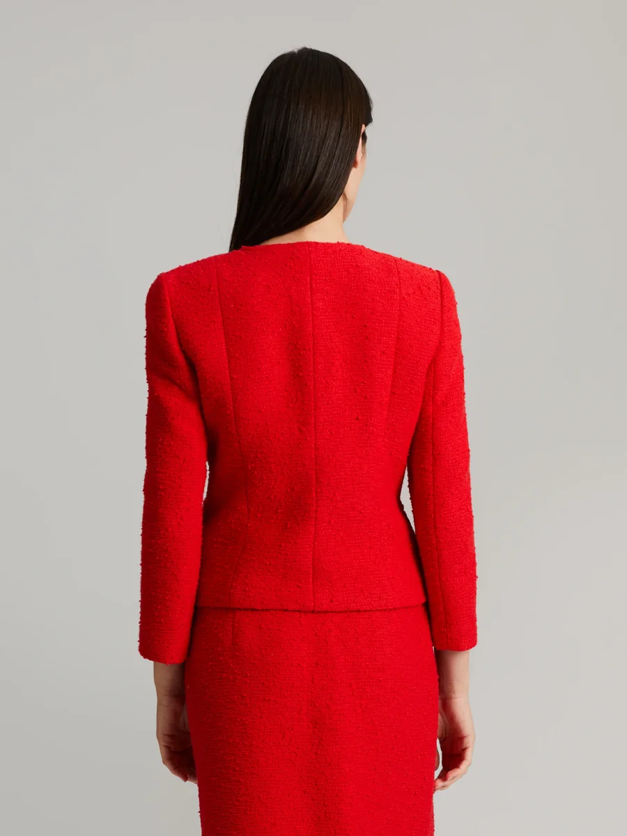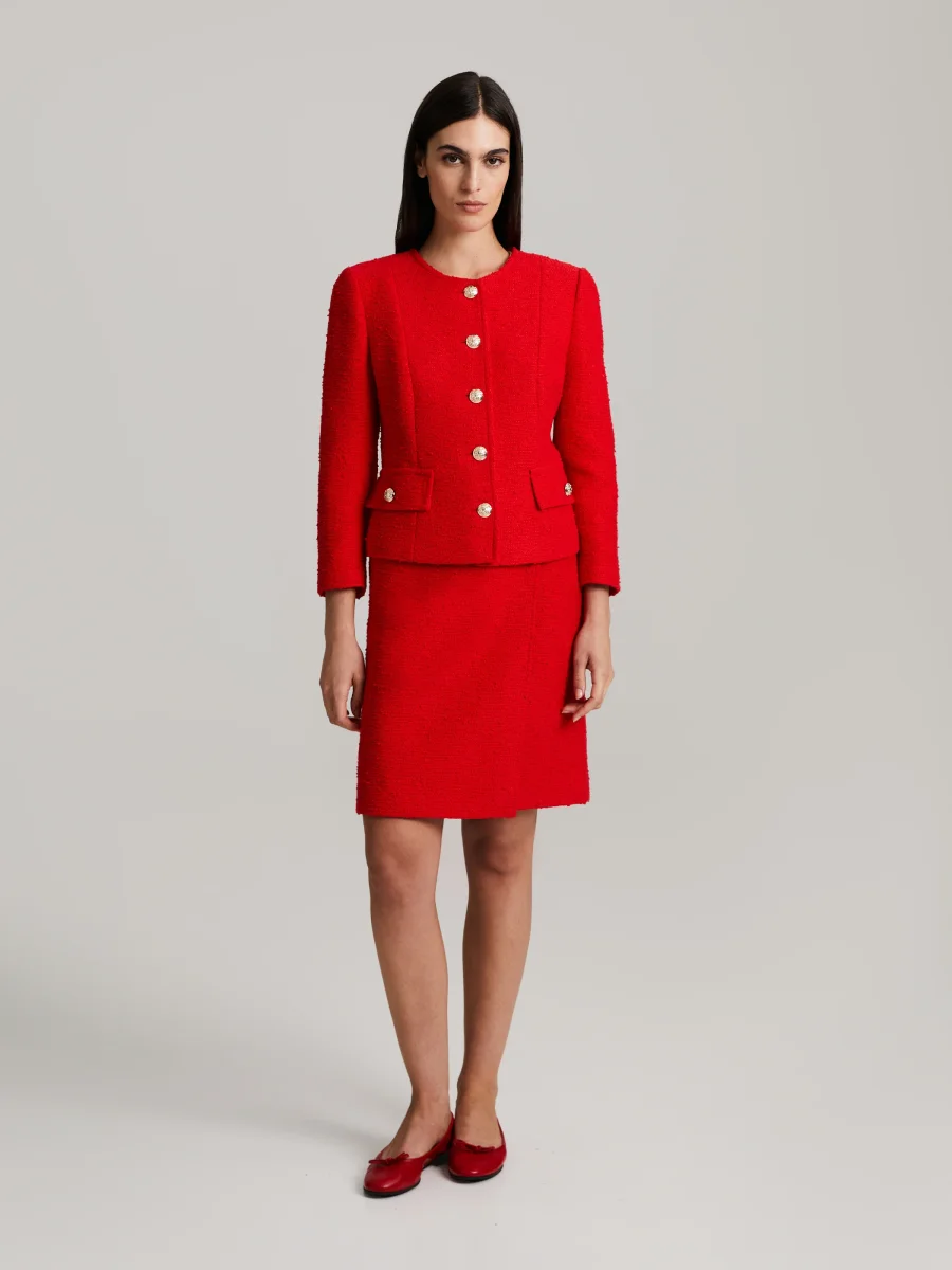 En stilren boucléjacka tillverkad av högkvalitativt italienskt tyg. Slim fit-modell, 3/4-ärmar och rund krage skapar en tidlös look. Guldknappar och dekorativa fickor or löstagbar vacker brosch fulländar stilen. En perfekt match med Celia-kjolen.