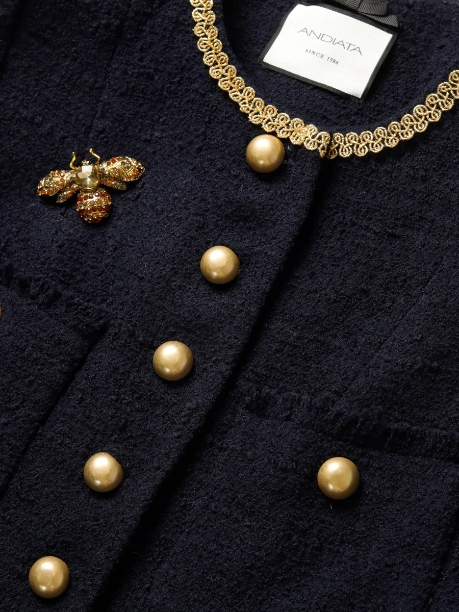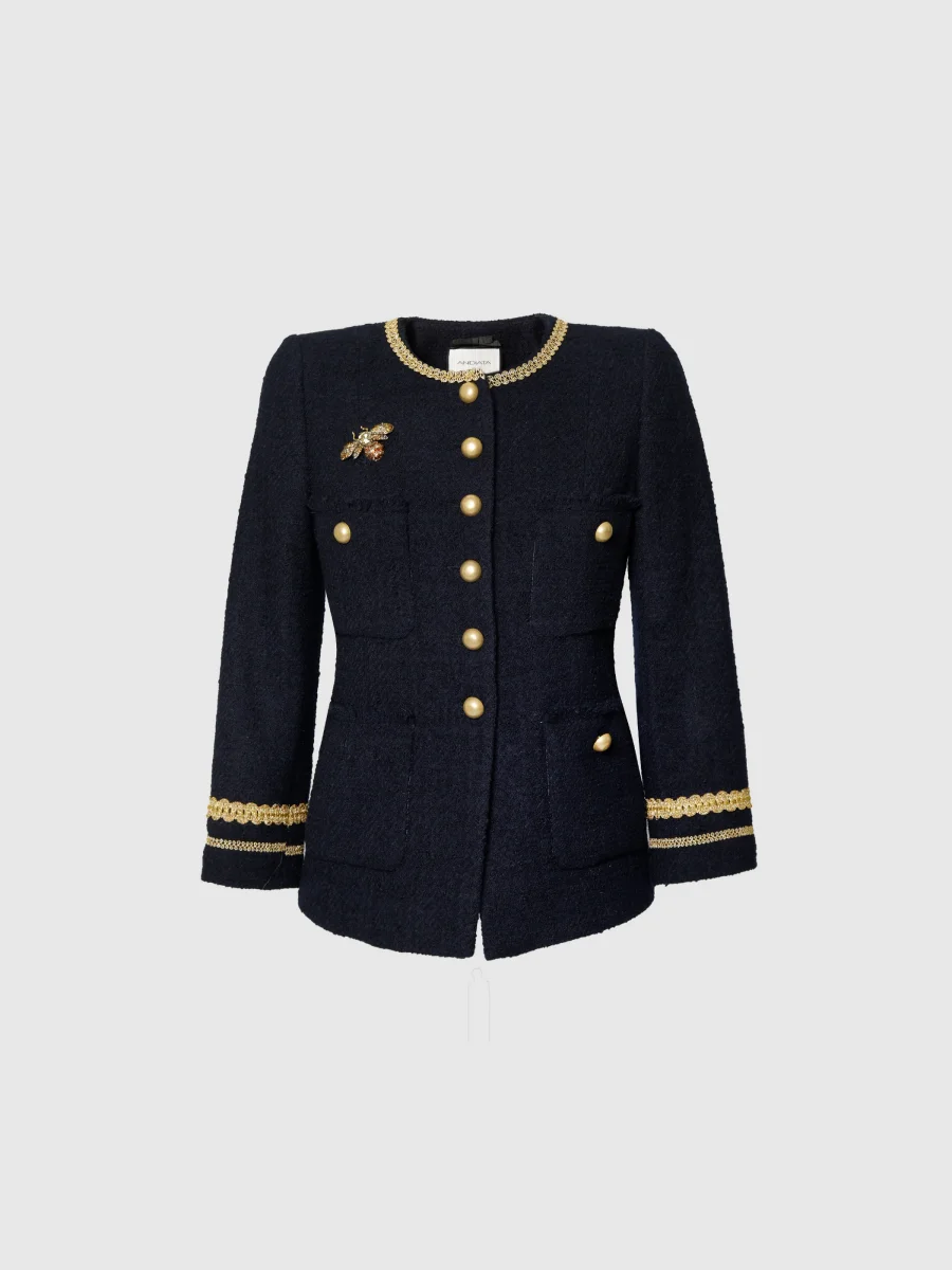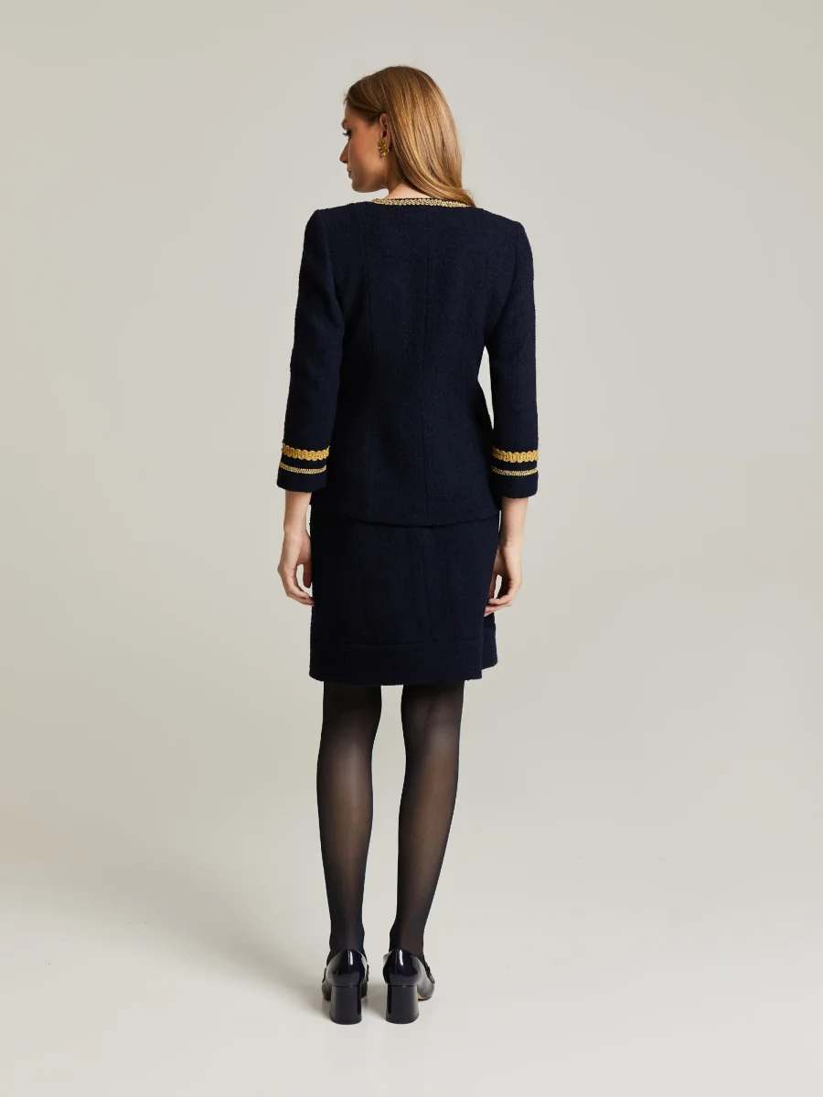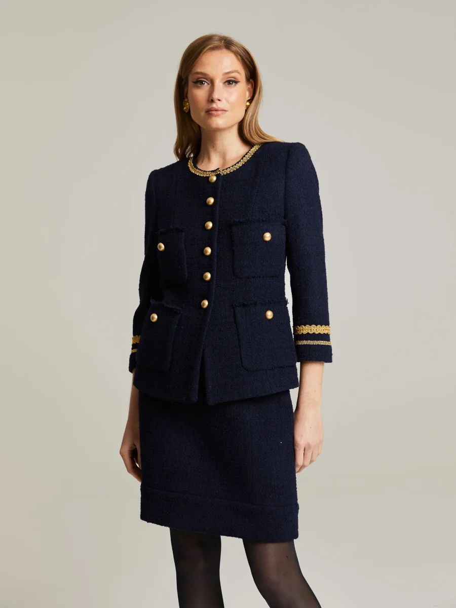 Boucle-kavaj i högkvalitativt italienskt tyg. Välpassande silhuett, 3/4 ärmar samt rund halsringning. Kavajen har guldknappar och dekorativa fuskfickor. Kombinera med matchande Liza Kjol. Bibroschen på bilderna säljs separat.