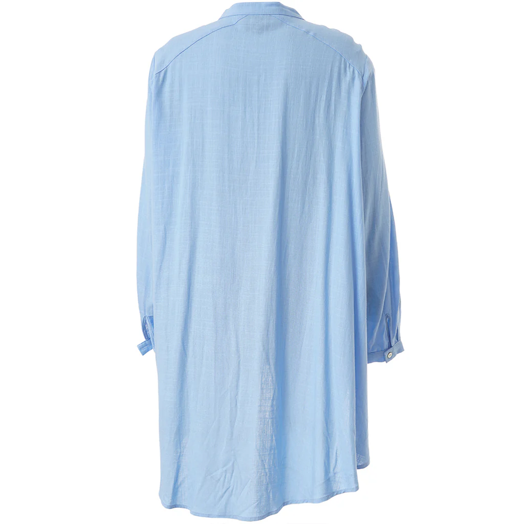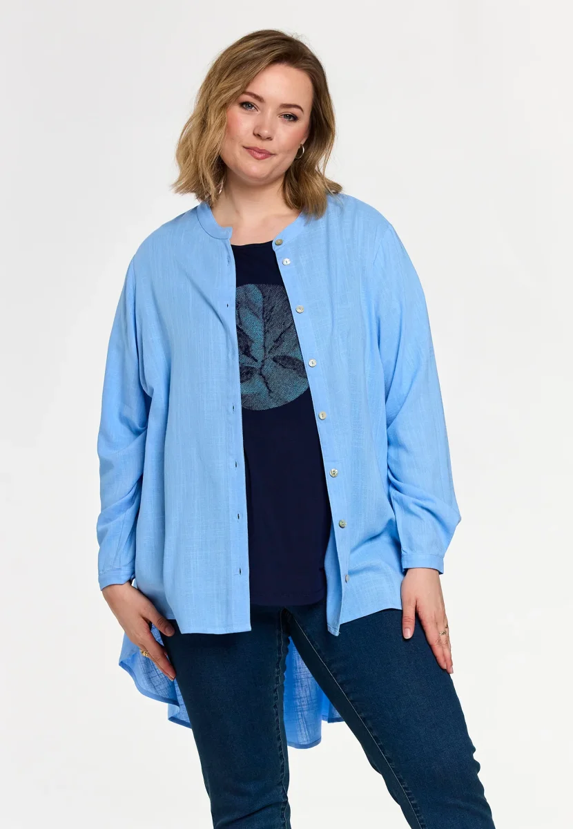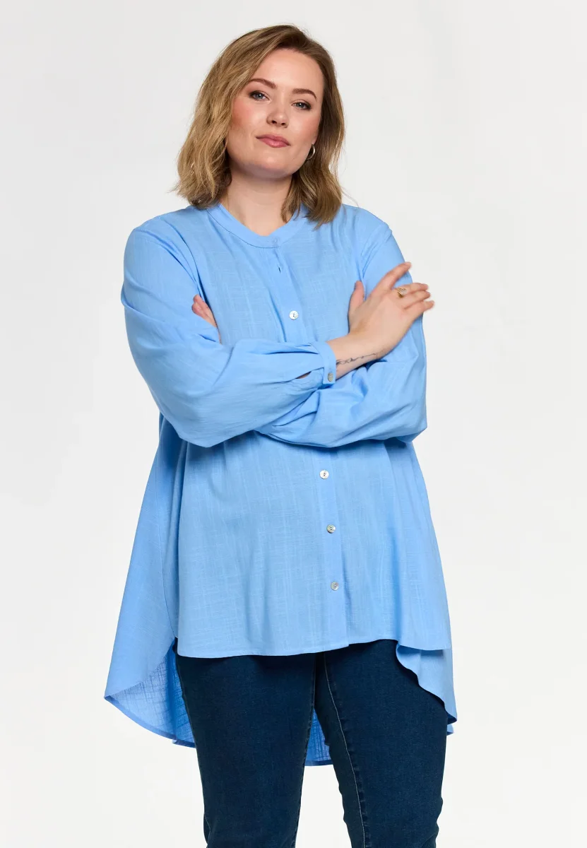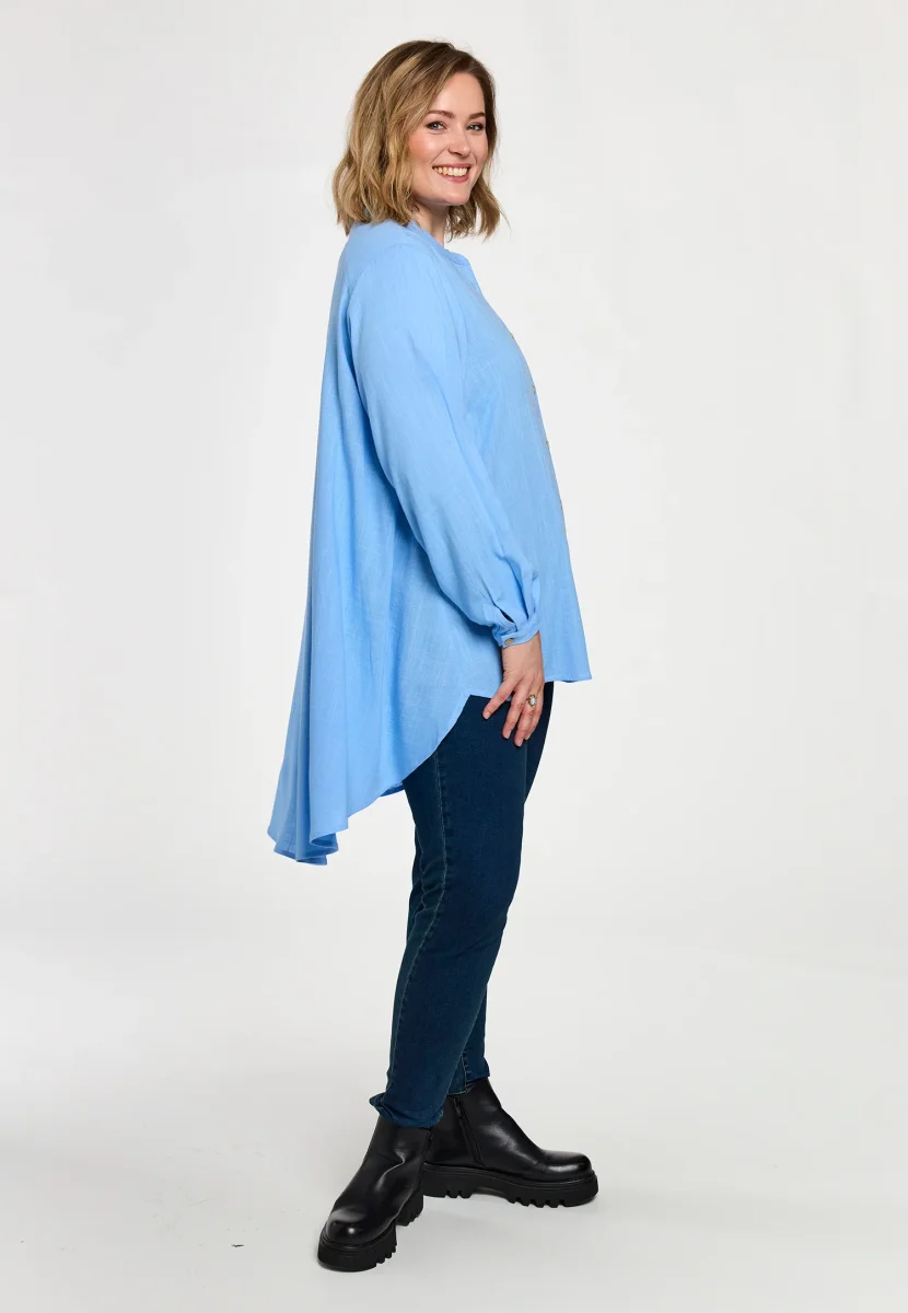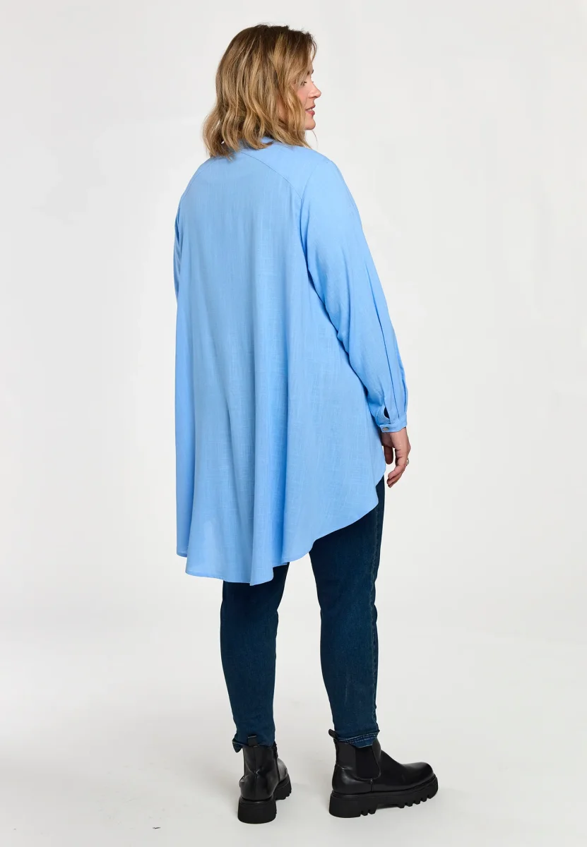 Härlig ljusblå skjorta med knappar hela vägen så du både kan bära den öppen och stängd, denna är snygg att bära till ett par fräscha jeans. Modellen är kortare fram och längre bak. Material: 100% viskos.