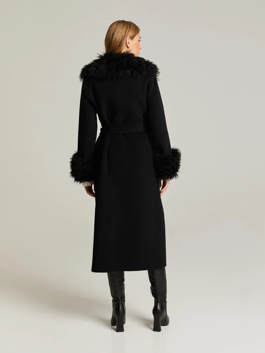 Ullkappa med lammpälskanter på ärmslut och krage. Feminin passform med hög midja, ett matchande avtagbart bälte, dolda tryckknappar, fickor med lock framtill och dolda fickor på sidorna. Ofodrad.