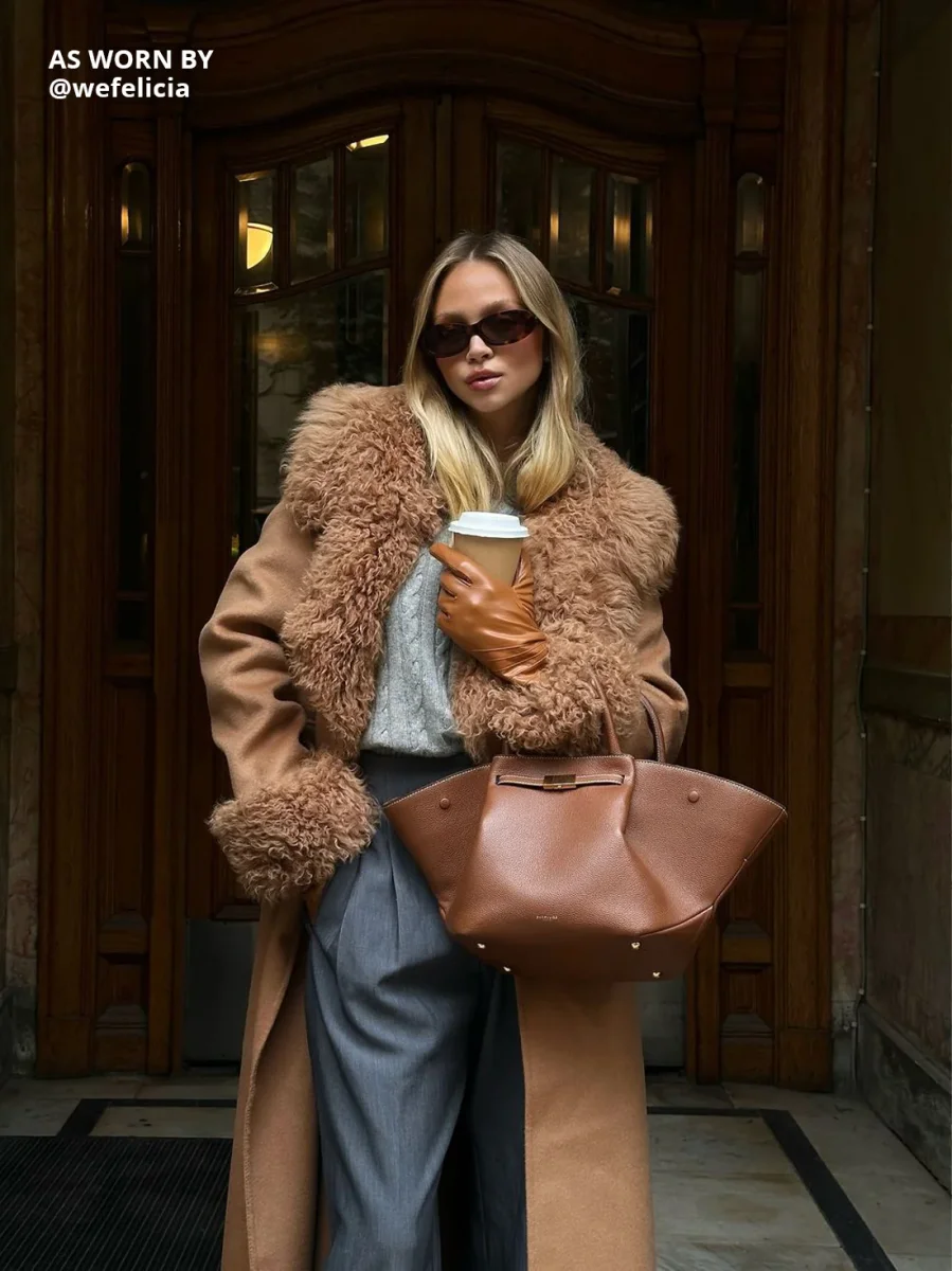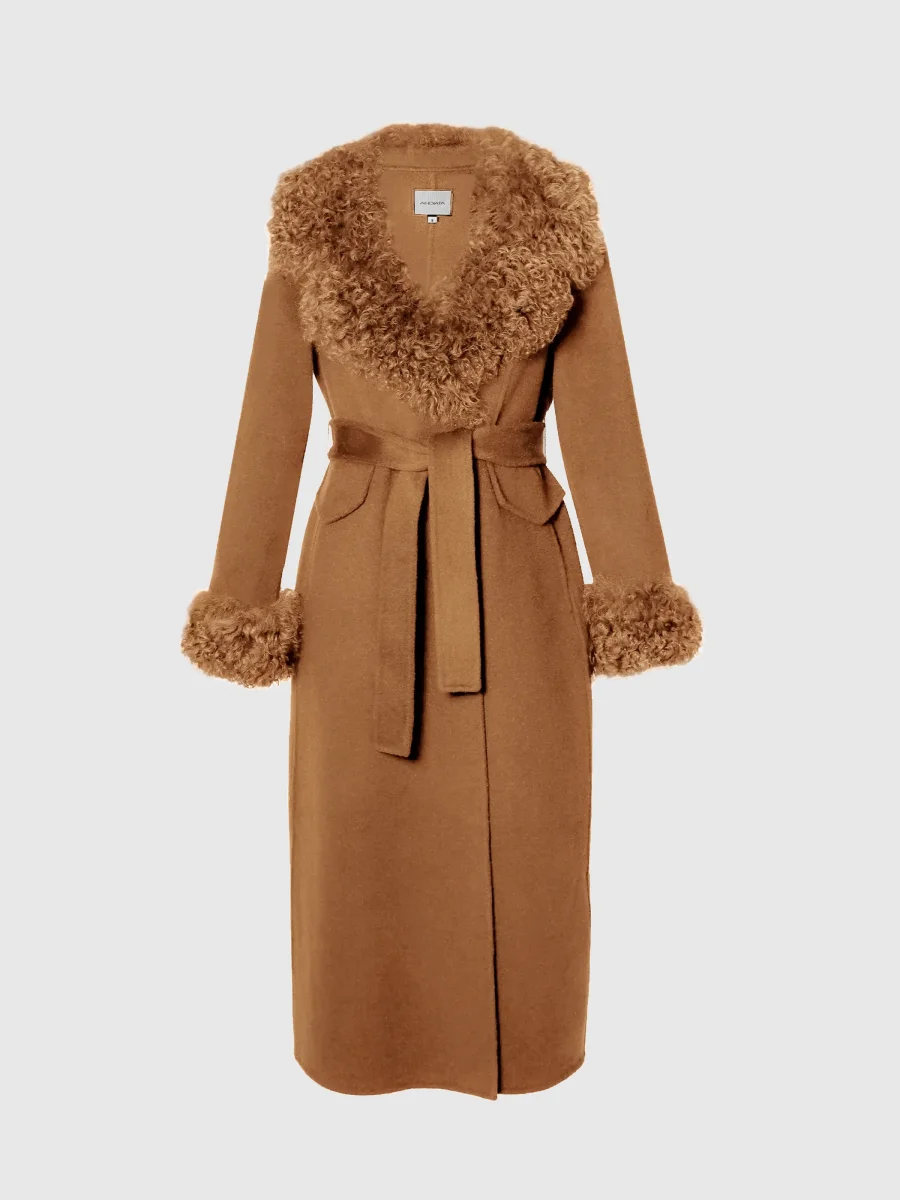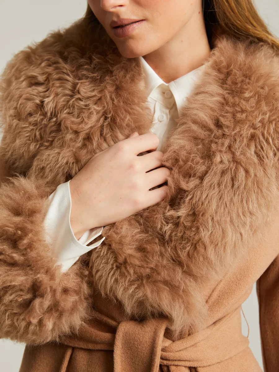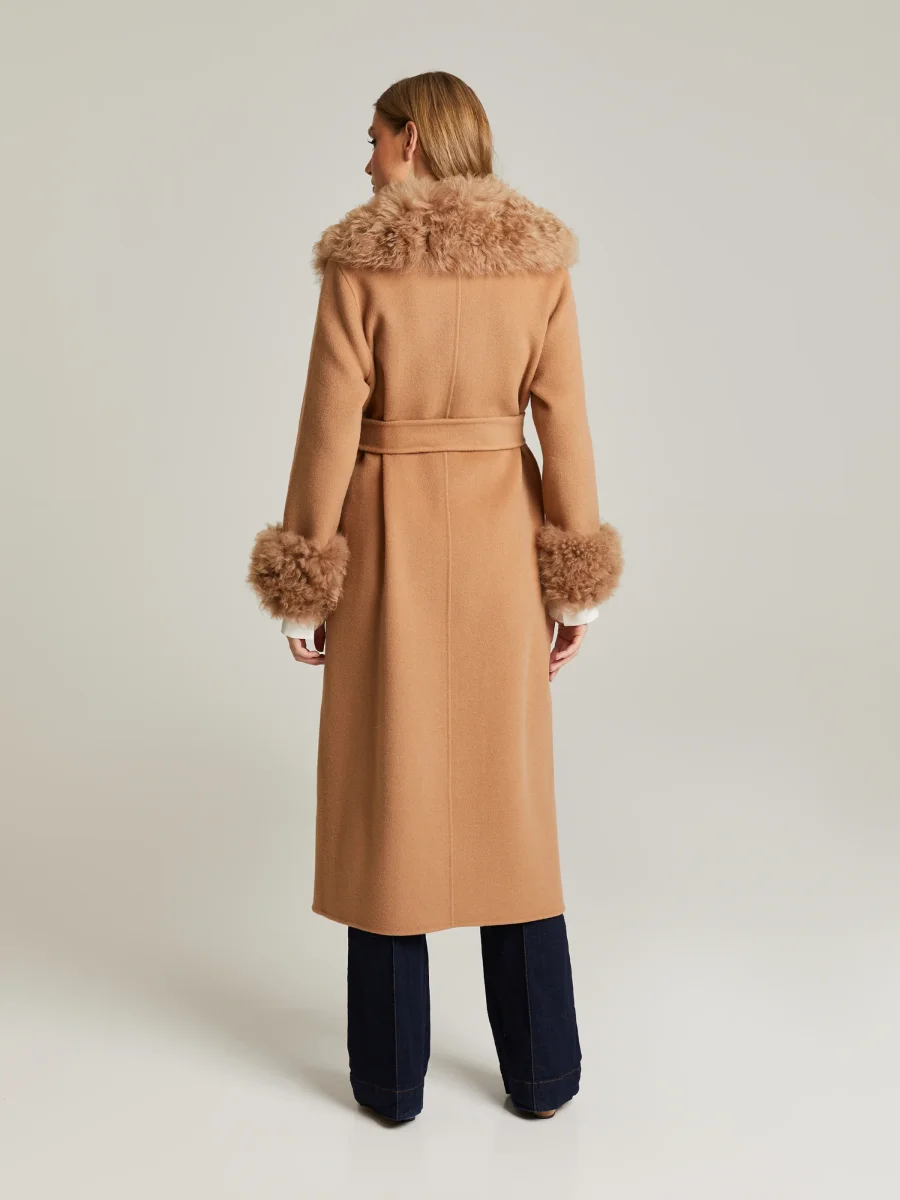 Ullkappa med lammpälskanter på ärmslut och krage. Feminin passform med hög midja, ett matchande avtagbart bälte, dolda tryckknappar, fickor med lock framtill och dolda fickor på sidorna. Ofodrad.