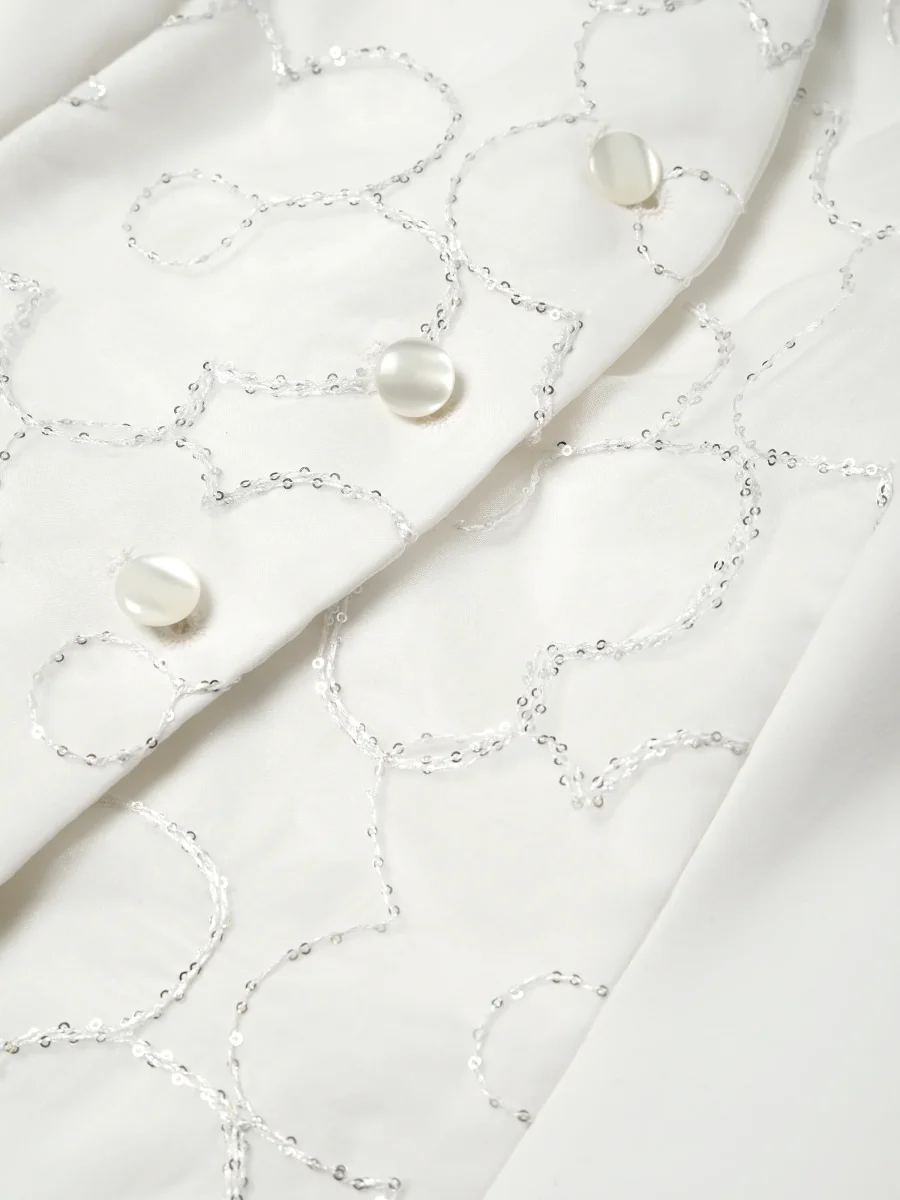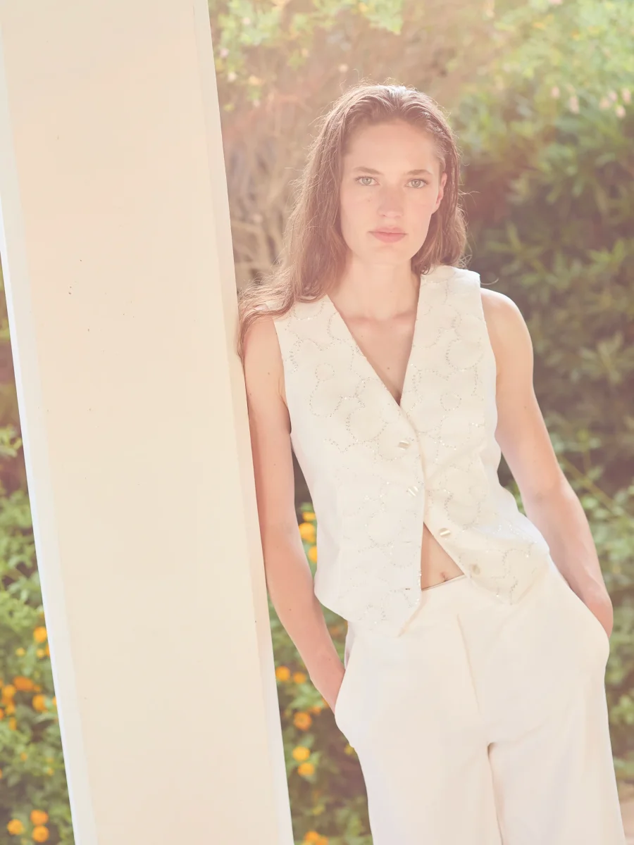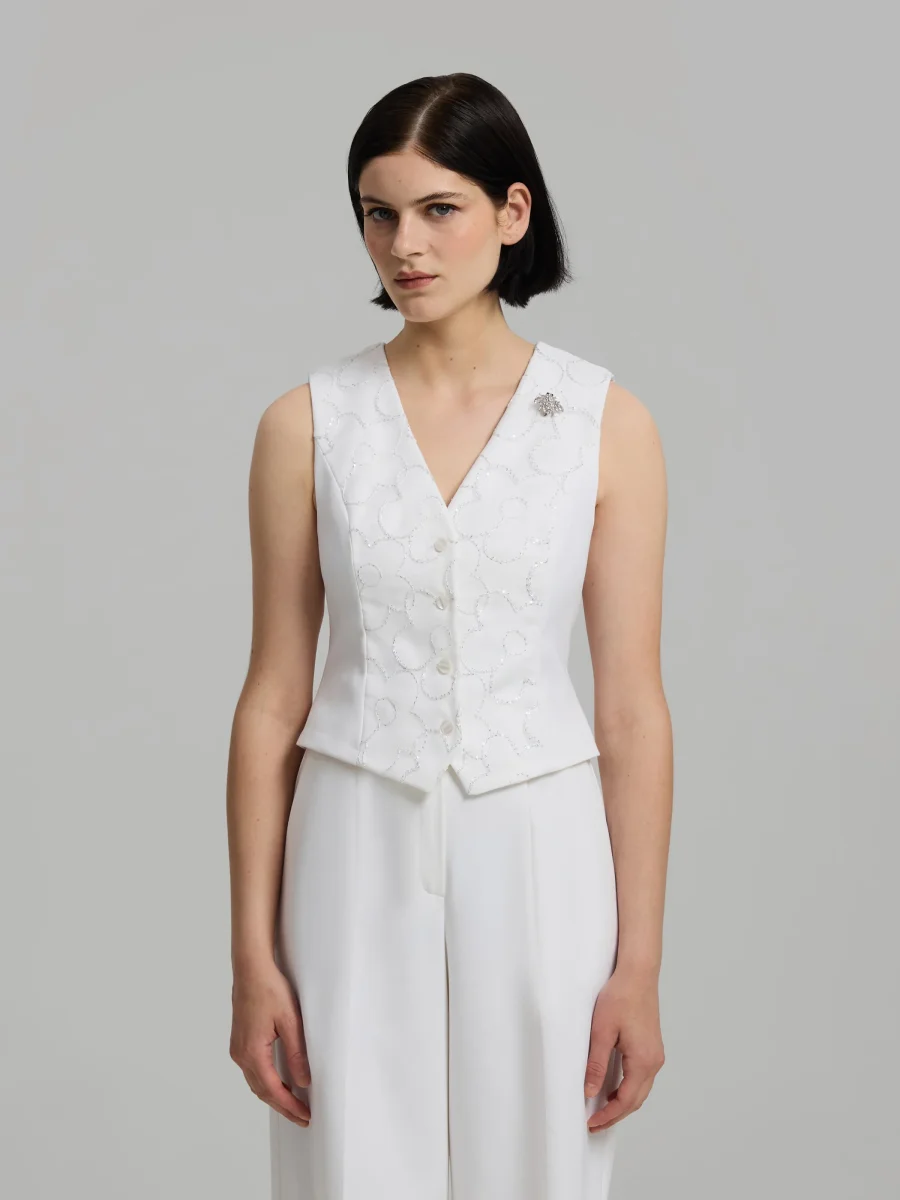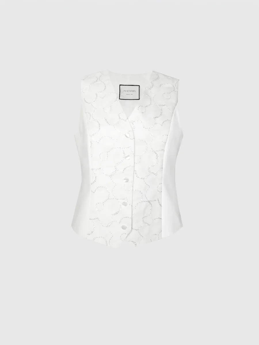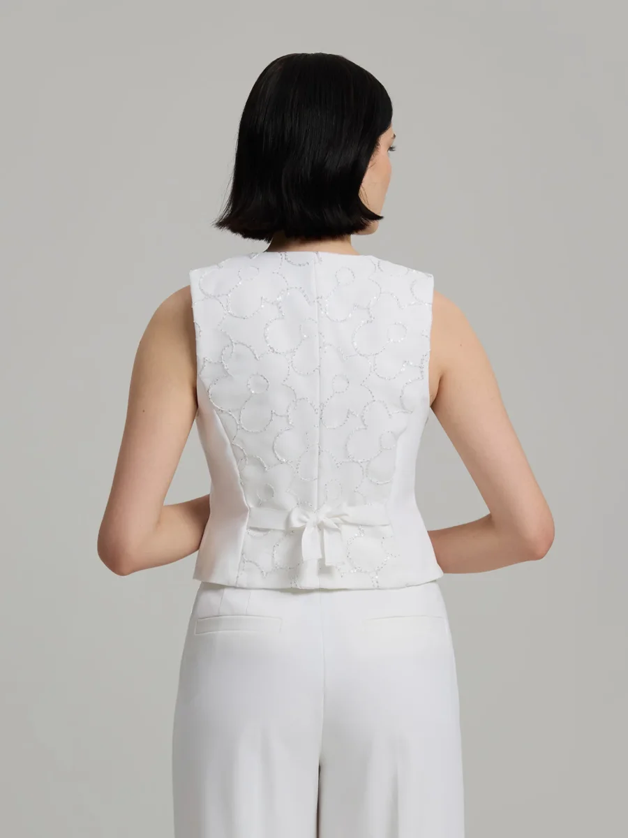 Tailored vest with a structured silhouette and V-neckline. Crafted from a stretch Italian cotton blend. Finished with a floral sequin overlay. Button closure at the front and adjustable ties at the back. Fully lined.
