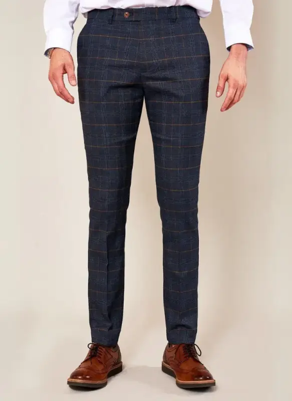 För en komplett och sammanhängande look, välj den tredelade kostymen Jenson i Marinblå. Denna kostym består av Marc Darcy Byxor Jenson, en matchande kavaj och en väst, alla i samma eleganta marinblå färg med rutmönster. Genom att välja hela kostymen får du en enhetlig och stilfull look som passar för alla formella tillfällen.
