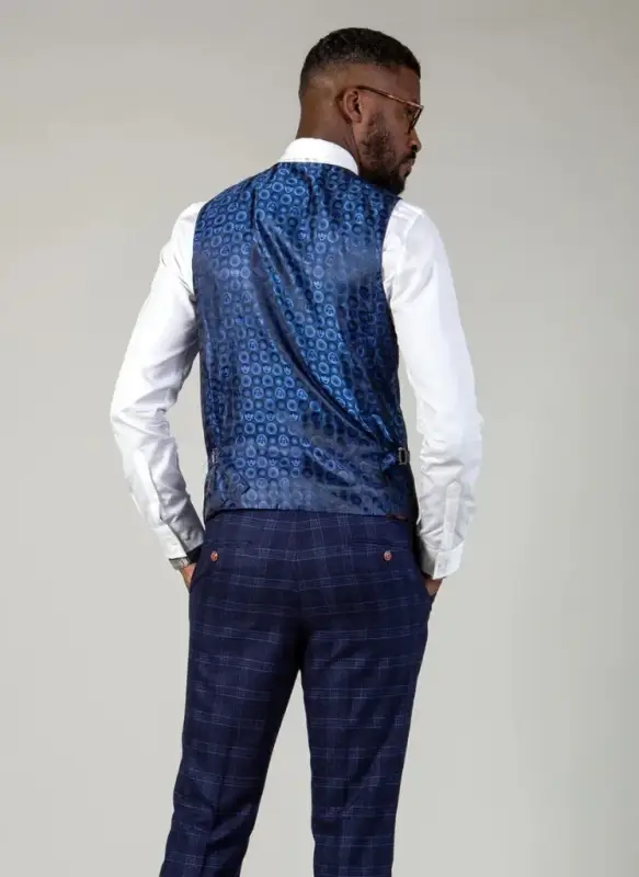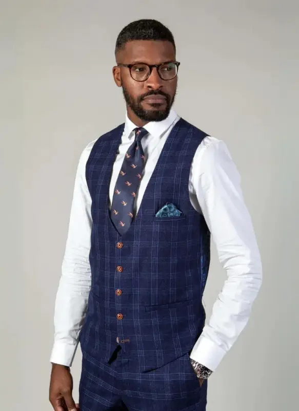 Vill du ha en komplett, stilfull look? Kombinera Marc Darcy-västen med den matchande Chigwell Tweedsuit. Denna kompletta kostym har samma raffinerade rutmönster och marinblå färg, vilket ger dig en harmonisk och elegant utstrålning. Den kompletta kostymen består av en matchande kavaj, en väst och ett par byxor, idealiskt för bröllop, affärsmöten eller andra formella tillfällen där du vill göra ett bestående intryck.