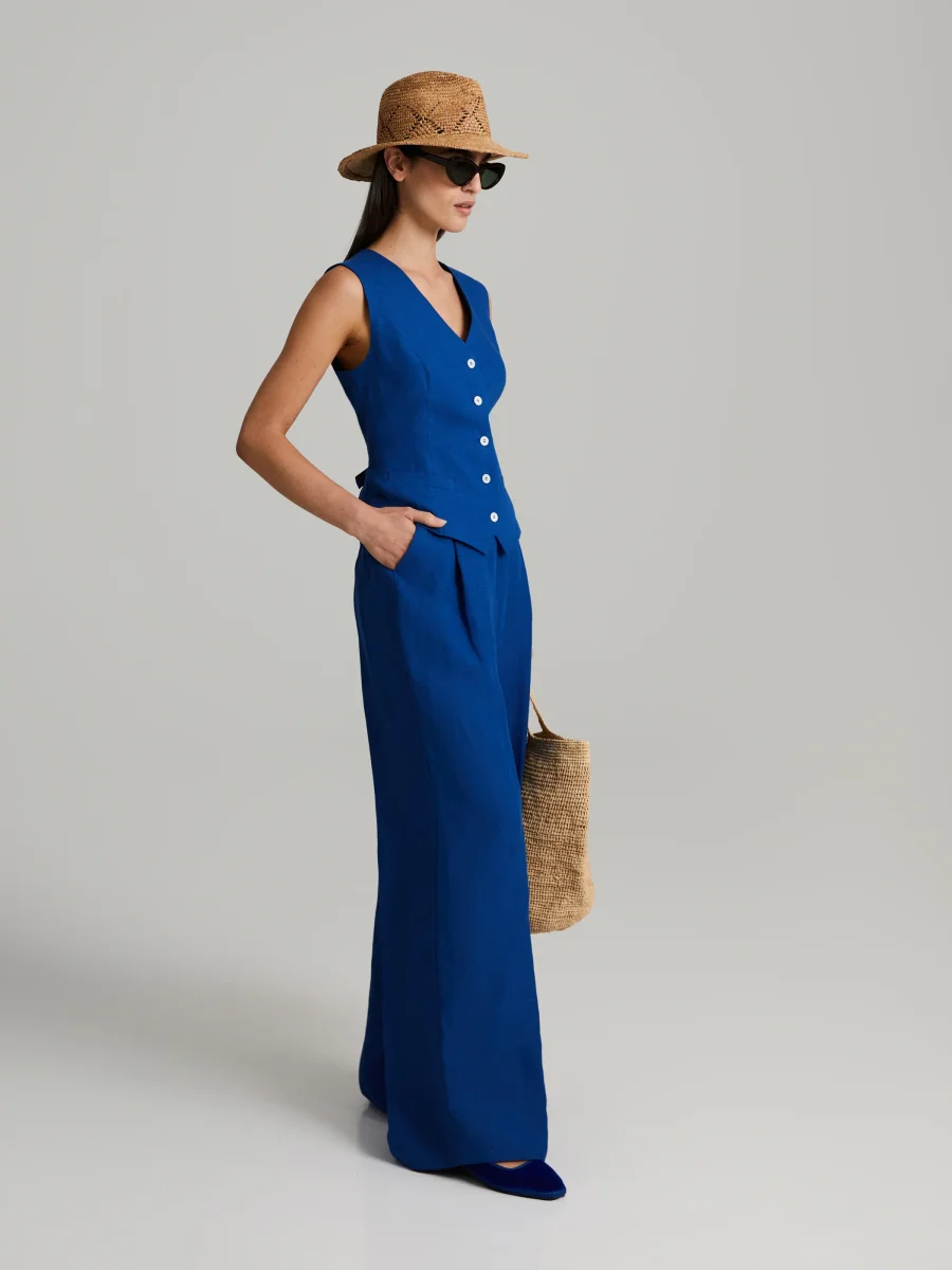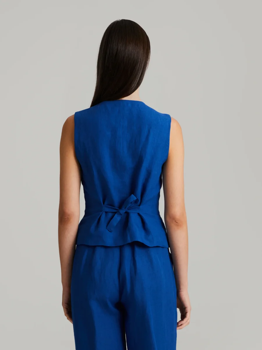 Skräddarsydd väst med smal passform. Fem knappar på framsidan och justerbar rem på ryggen. Fodrad.