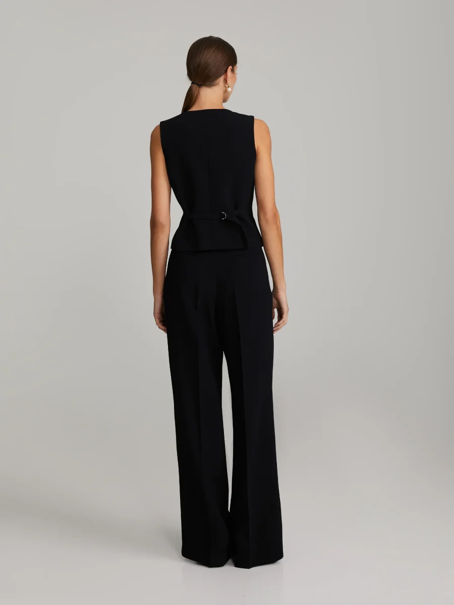 Skräddarsydd väst med smal passform. Fem knappar på framsidan och justerbar rem med silverspänne på ryggen. Fodrad baktill.