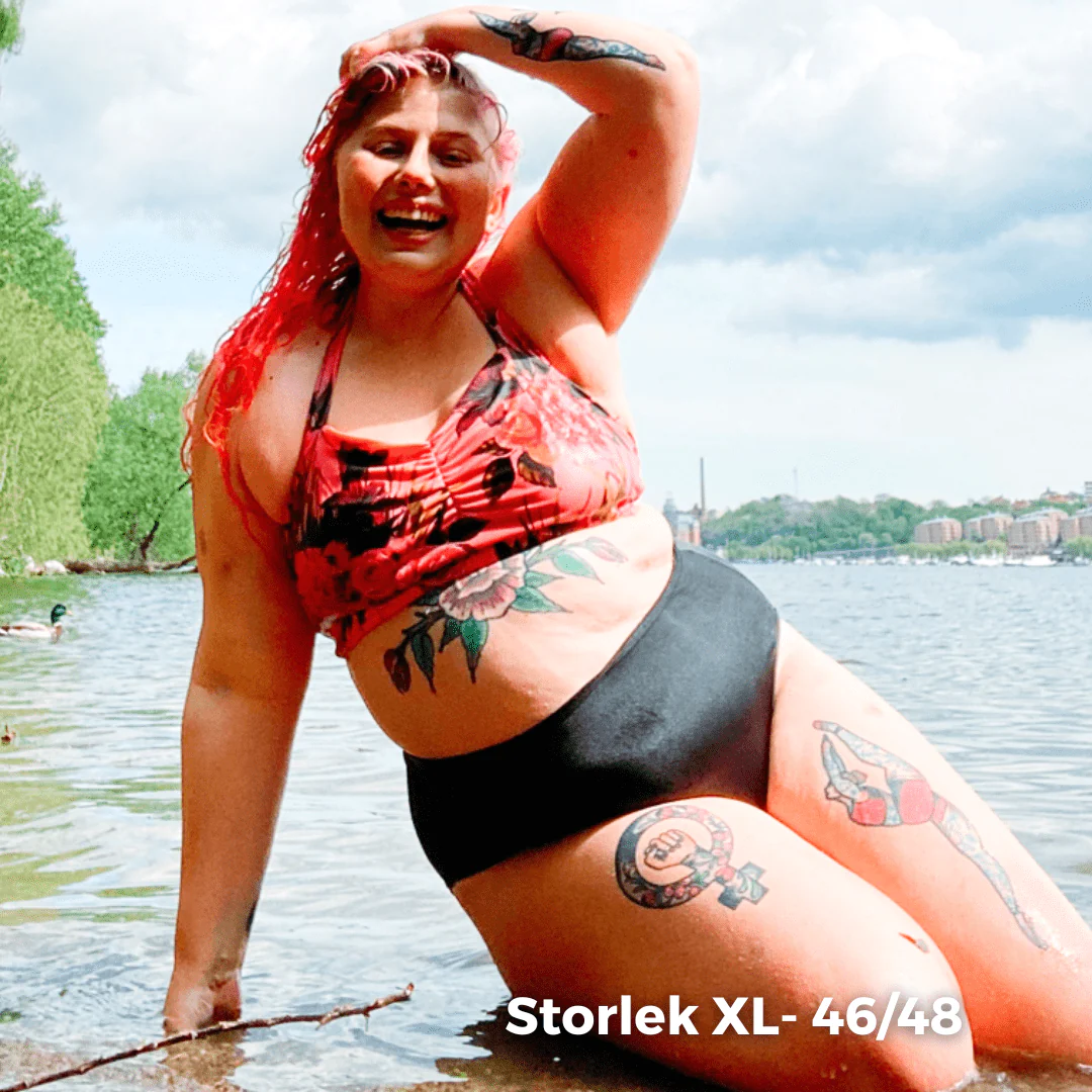 Menstrosa för bad, simning & vattensport – hög midja Svart / Mörk turkosgrön Inbyggt mensskydd i grenen (24 cm långt i strlk M) Ersätter tampong/menskopp eller annat mensskydd Absorberar mensen och hindrar den från att läcka ut Funkar för måttlig mens i vatten och riklig mens när den är torr Kan användas under annan bikini/baddräkt […]