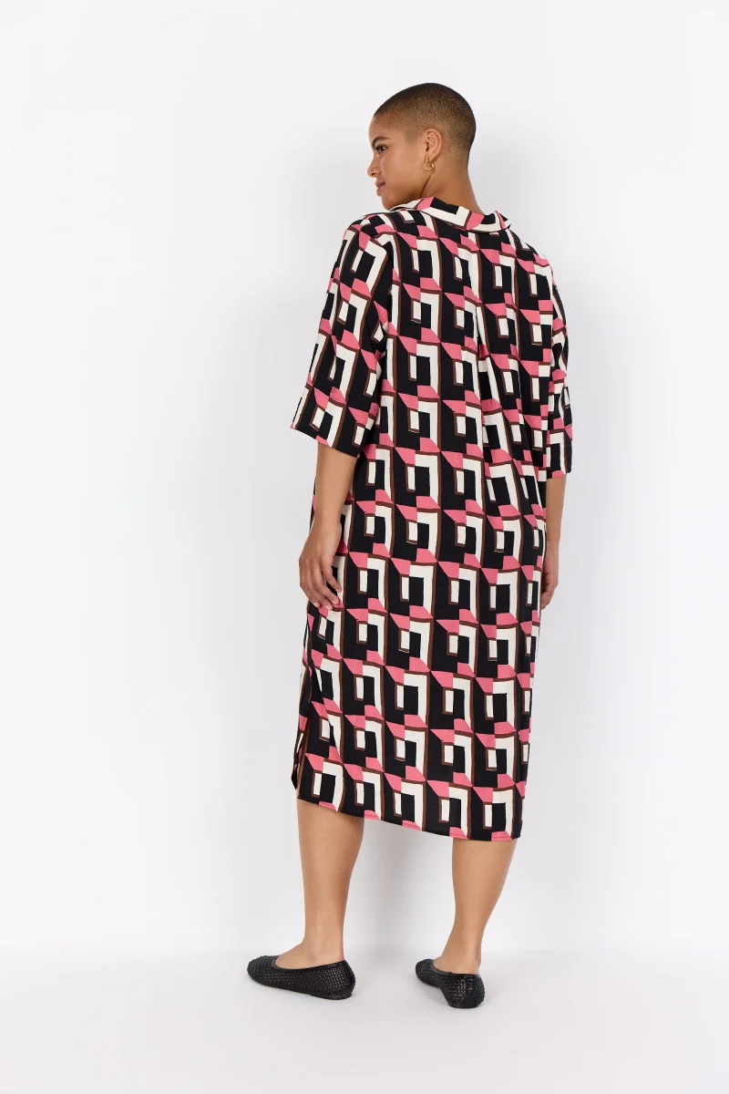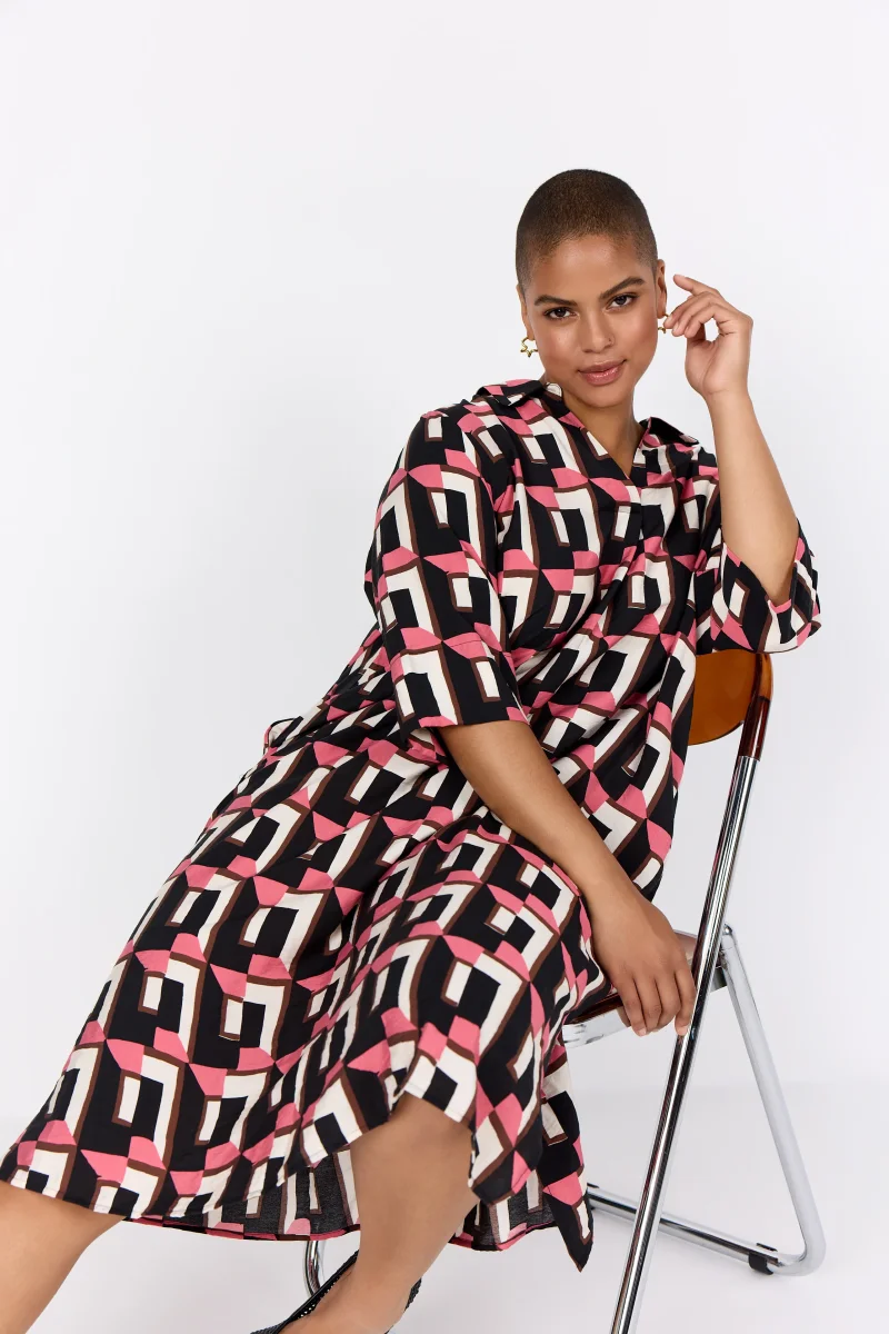 En feminin klänning tillverkad av 82% viskos, 18% polyamid.Klänningen har en hackad krage, ett snyggt geometriskt tryck och faller till en längd mitt på vaden. Kombinera denna eleganta klänning med enkla sandaler eller snygga boots för en cool look. A-formad modell.Normal i storleken.