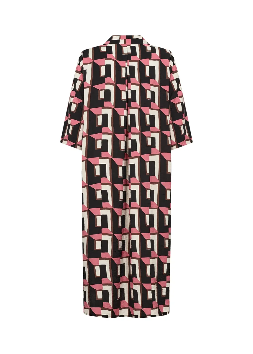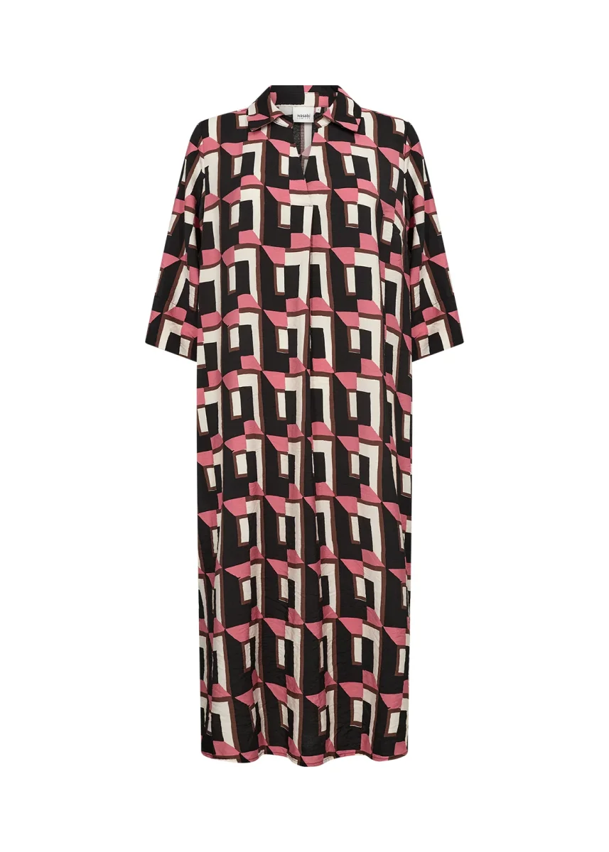 Klänningen har en hackad krage, ett snyggt geometriskt tryck och faller till en längd mitt på vaden. Kombinera denna eleganta klänning med enkla sandaler eller snygga boots för en cool look.