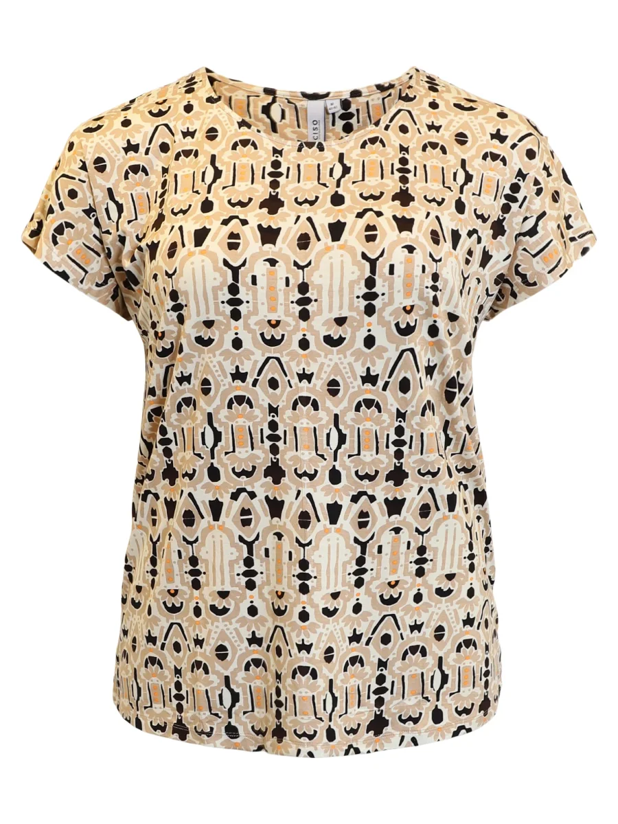 En stilren topp med ett unikt, grafiskt mönster i varma toner som lyfter vilken outfit som helst.