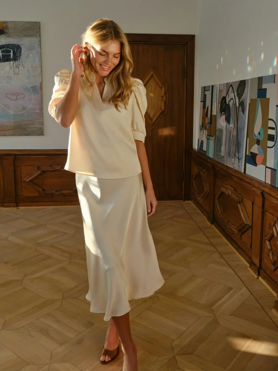 Lång kjol med elastik inuti midjan. Kjolen är snedskuren och har en mycket smickrande passform. Kvaliteten är en fin slät satin.