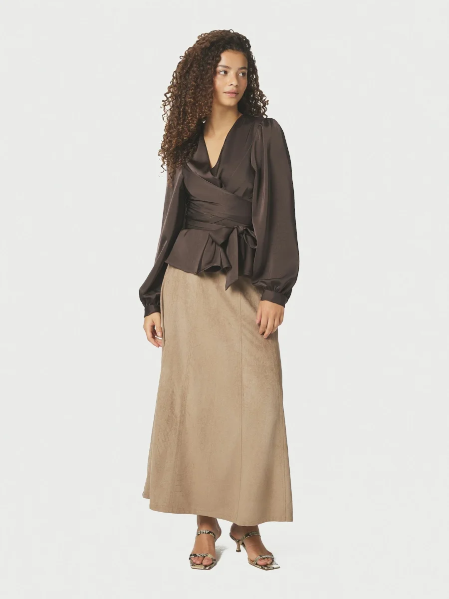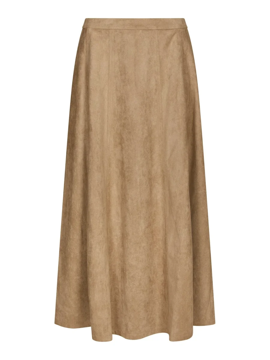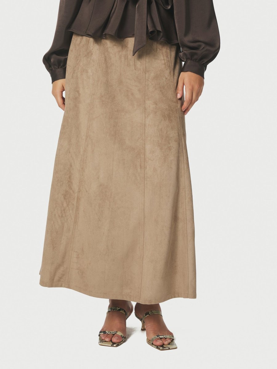 Snygg lång mockakjol med sömmar för en mer kurvig form. Kjolen har en dragkedja och sitter mycket smickrande. Modellen är 176 cm lång och bär storlek 36.