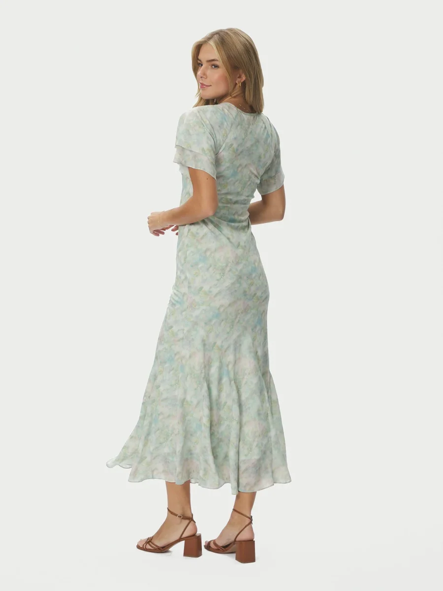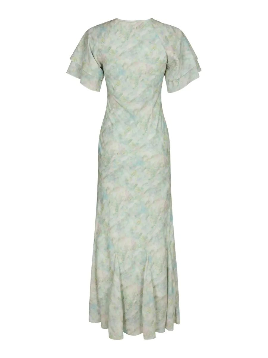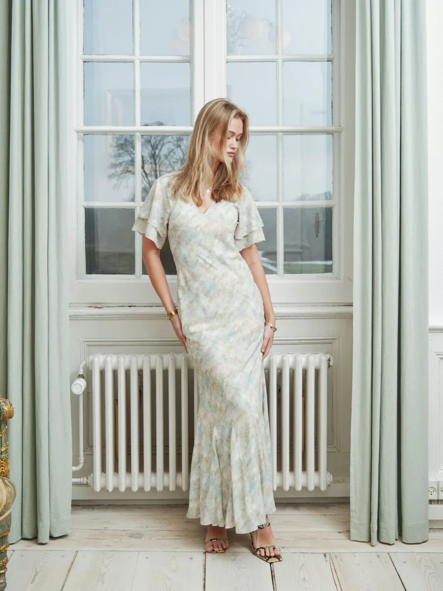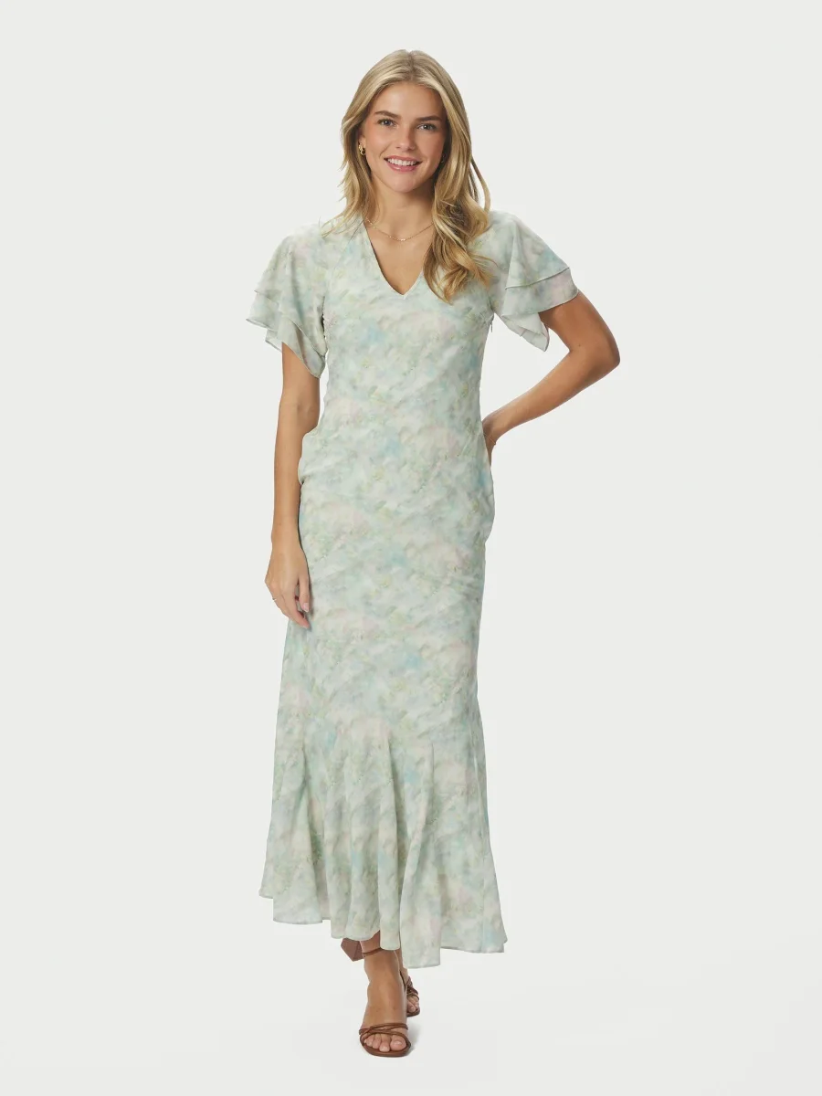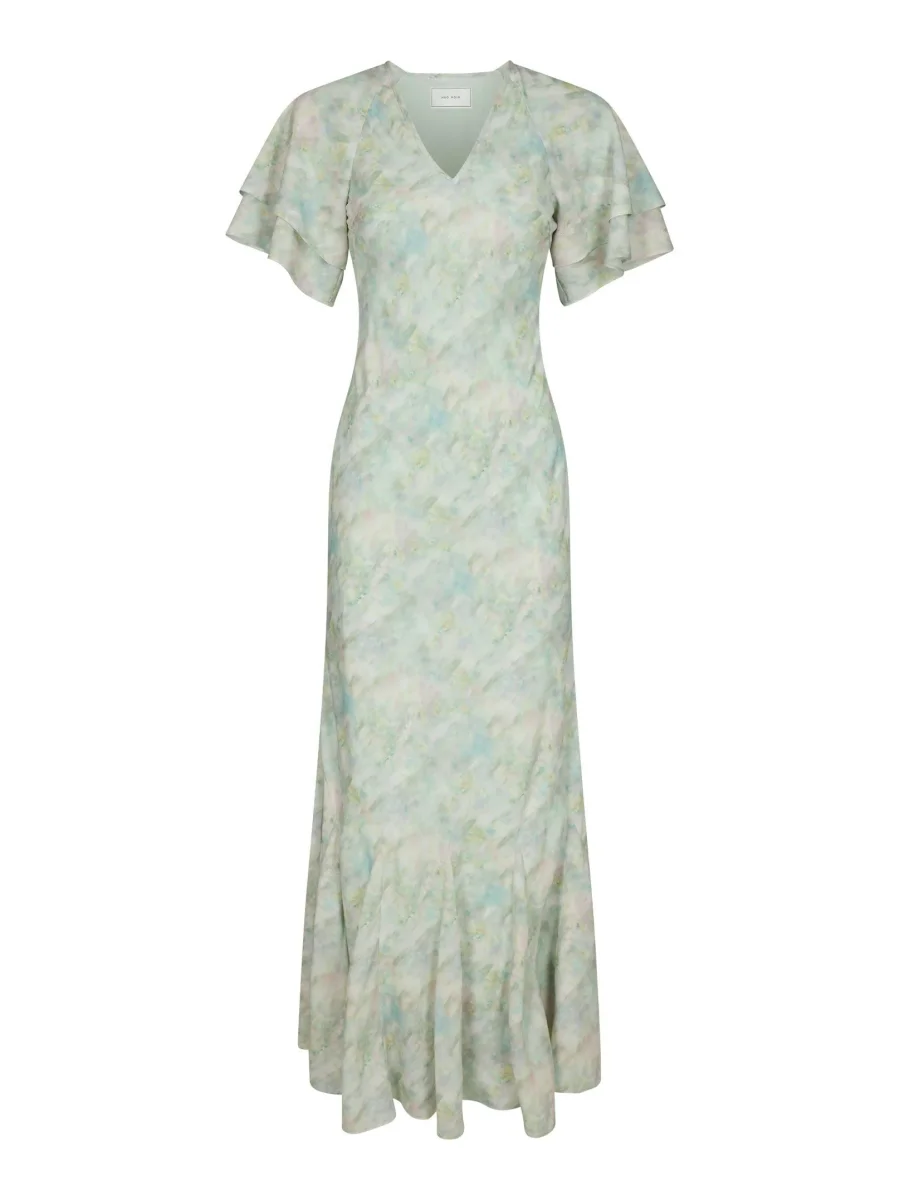 Lång klänning med flödande ärmar och V-ringning fram. Modellen är 176 cm och bär storlek 36.