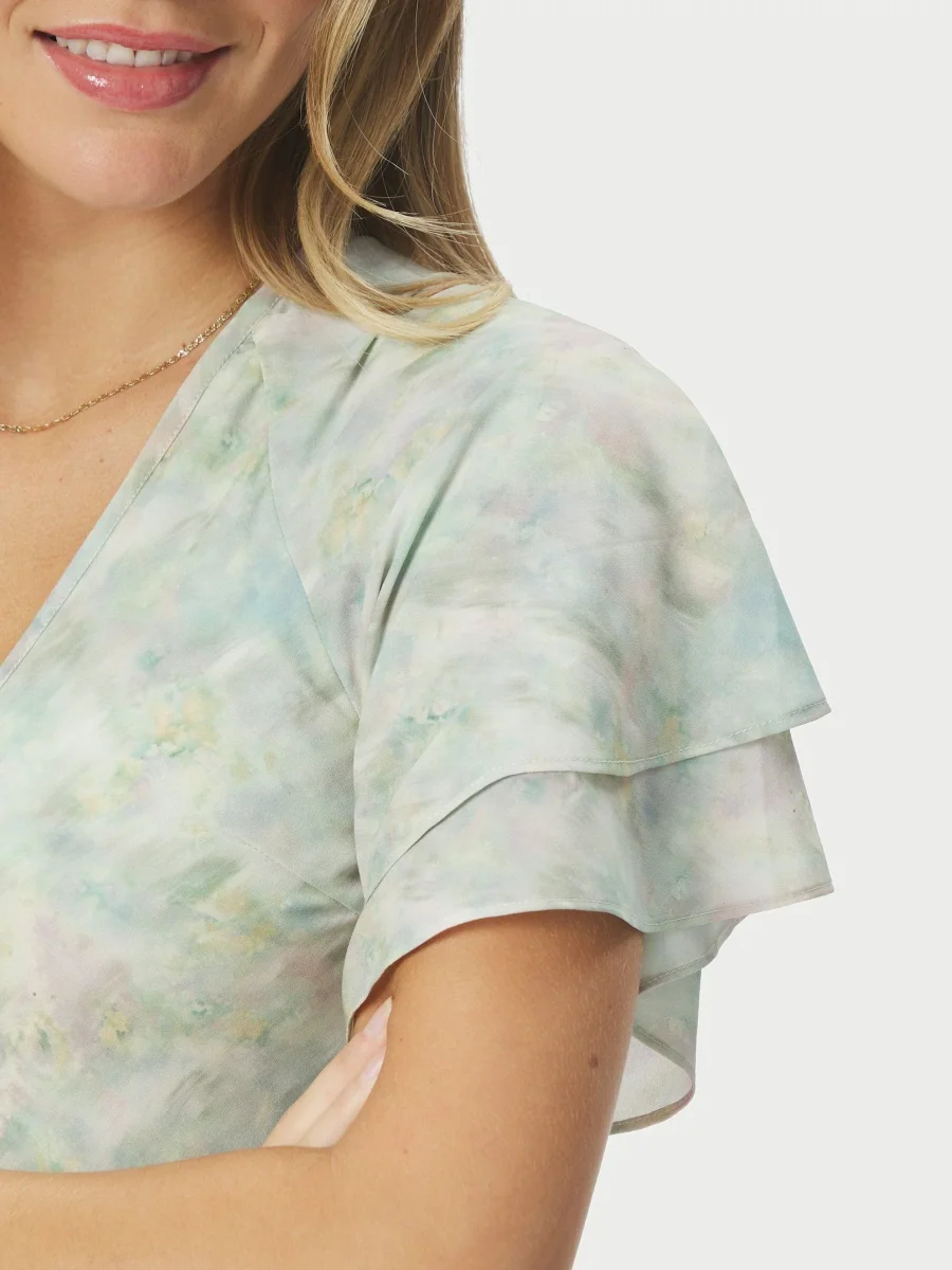 Lång klänning med flödande ärmar och V-ringning fram. Modellen är 176 cm och bär storlek 36. Stilkod: 167704 Material: 100% Polyester Färg: Light Green