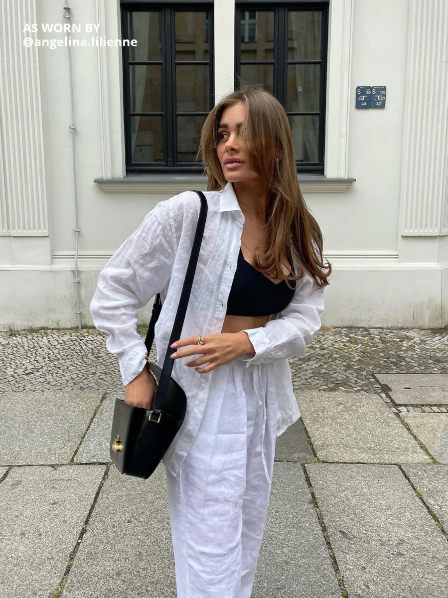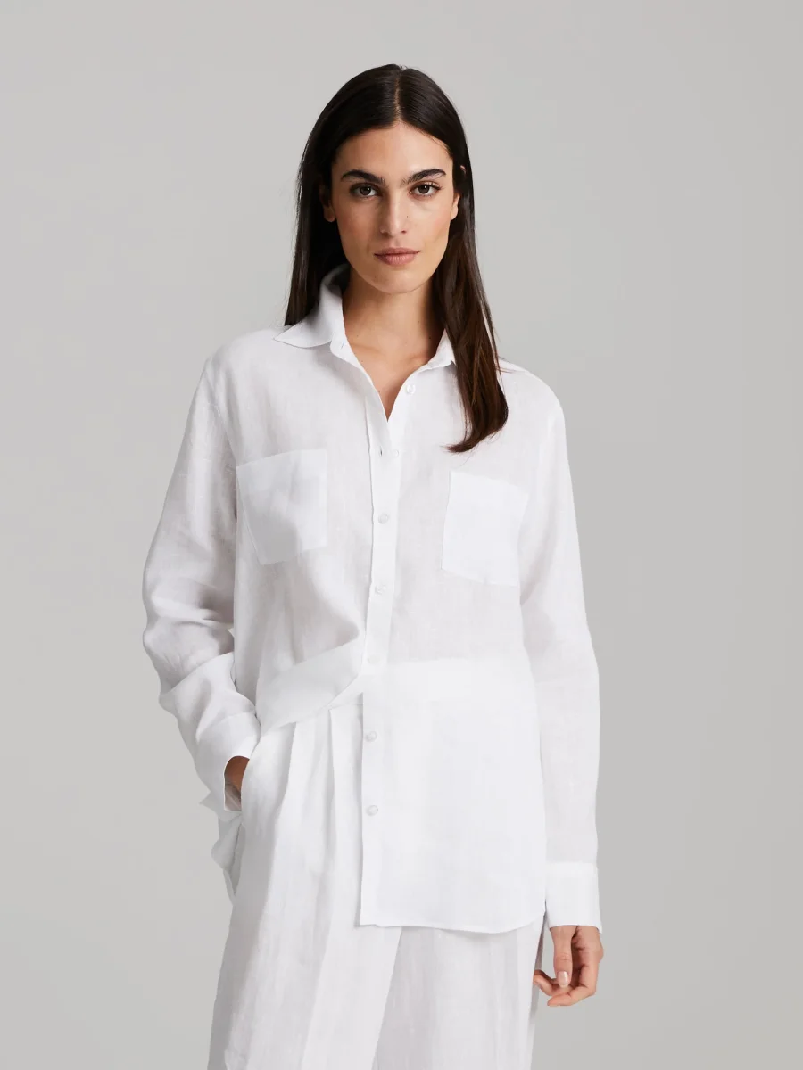 Linneskjorta med avslappnad passform. Spetsig krage, två bröstfickor fram, knäppning och knappar vid ärmslut.