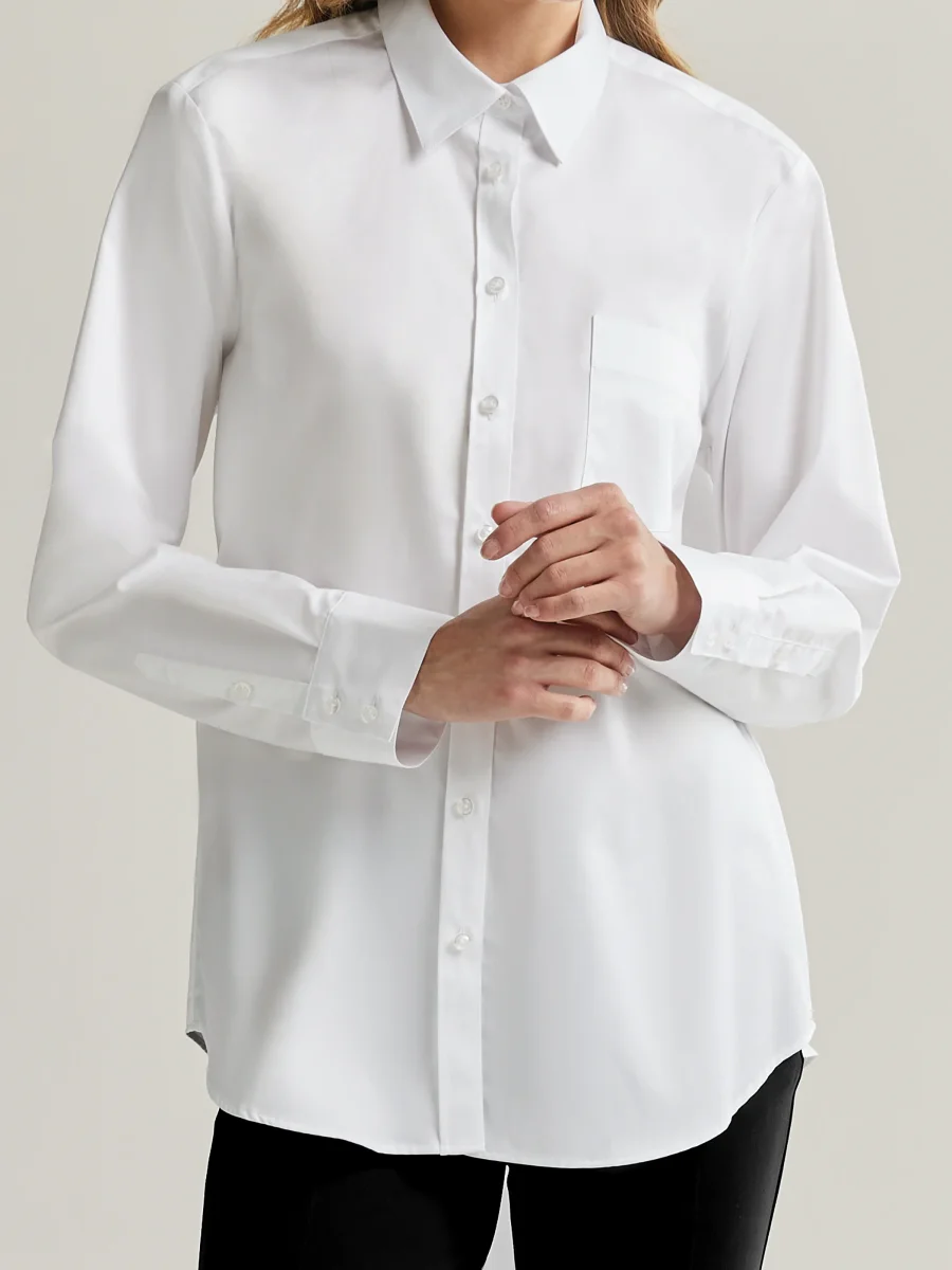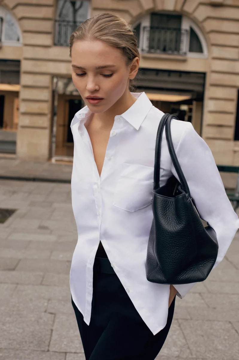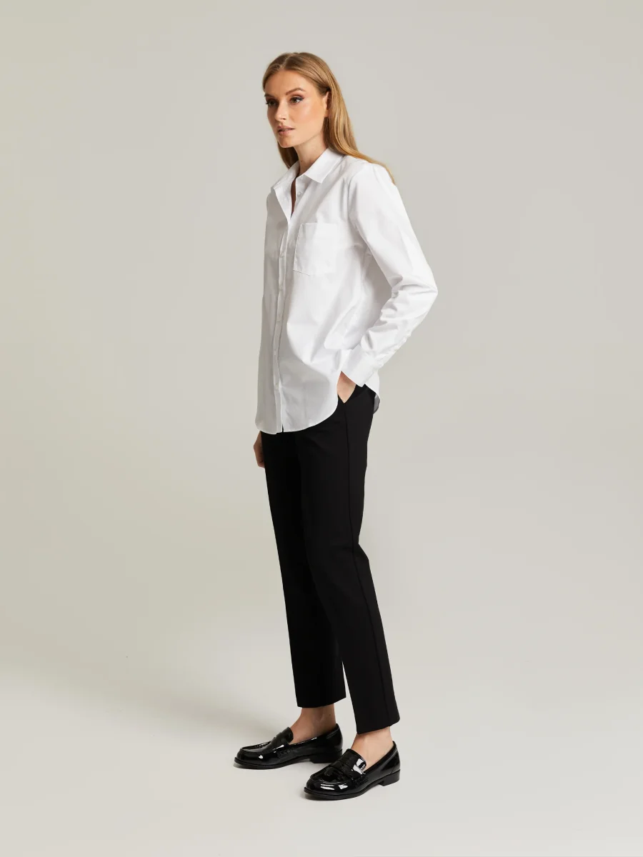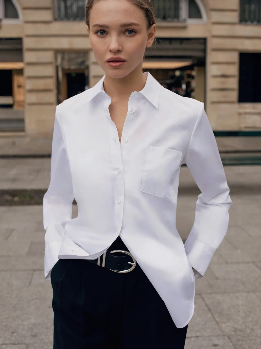En vardagsskjorta i bomull med rak skärning, spetsig krage och en bröstficka på framsidan. Knappar vid manschetterna. Perfekt för att skapa feminina och formella looks.